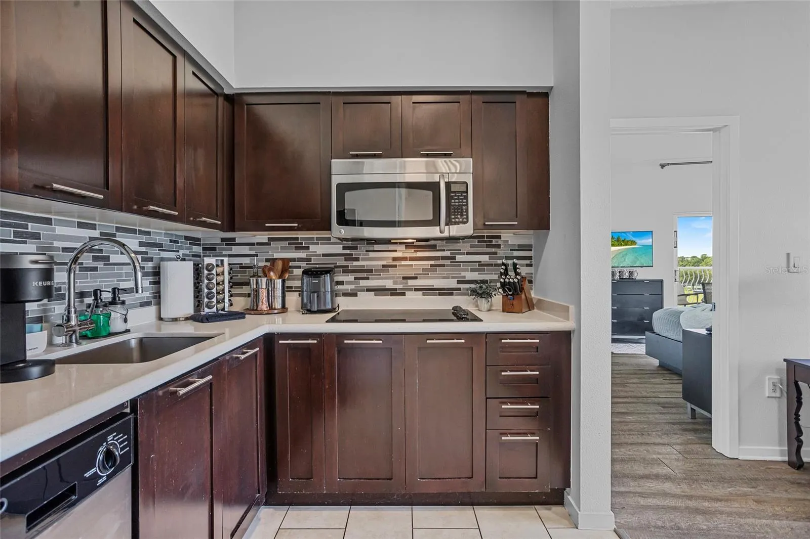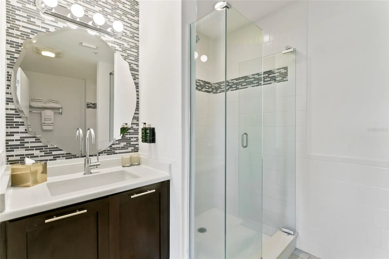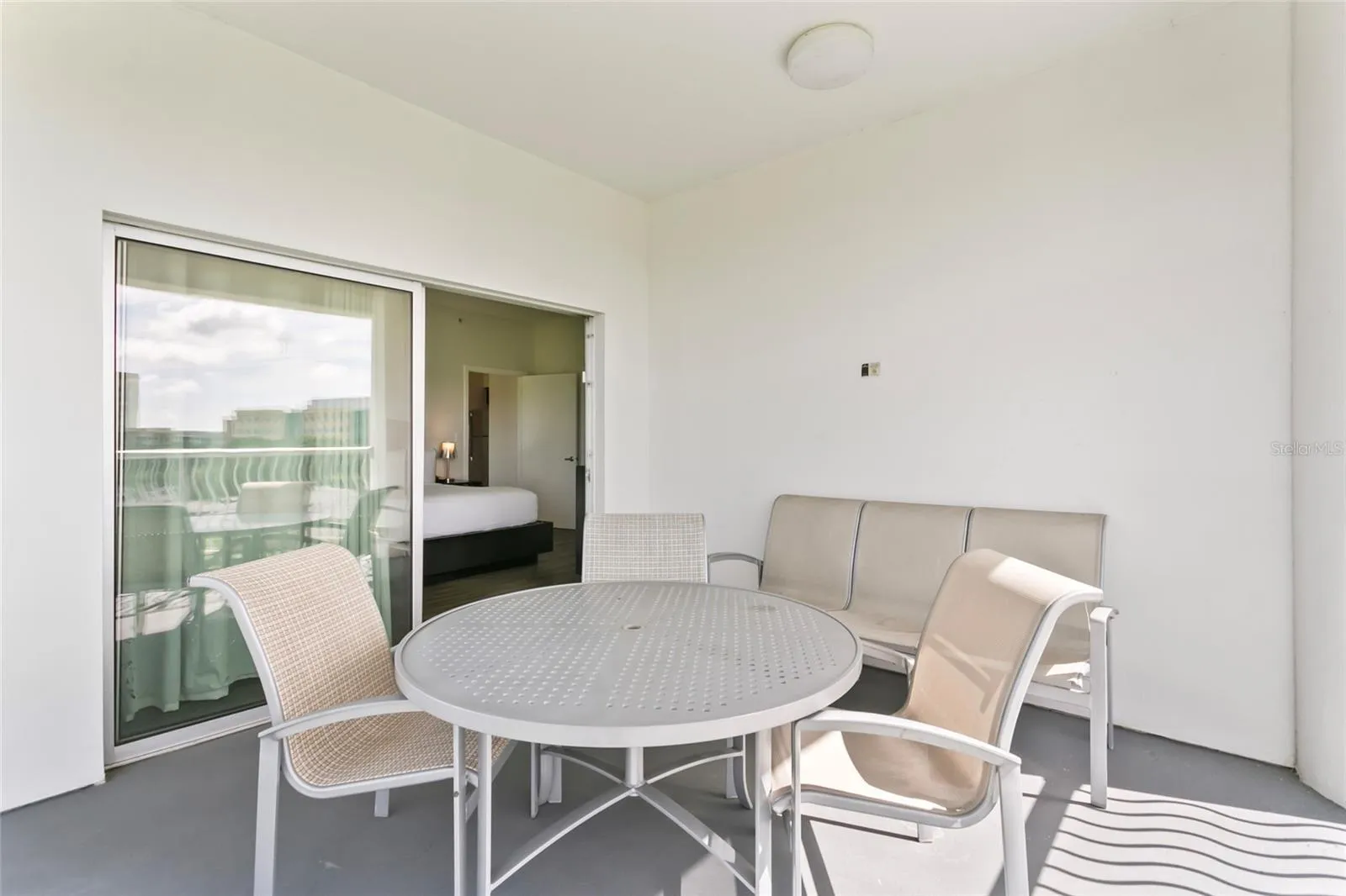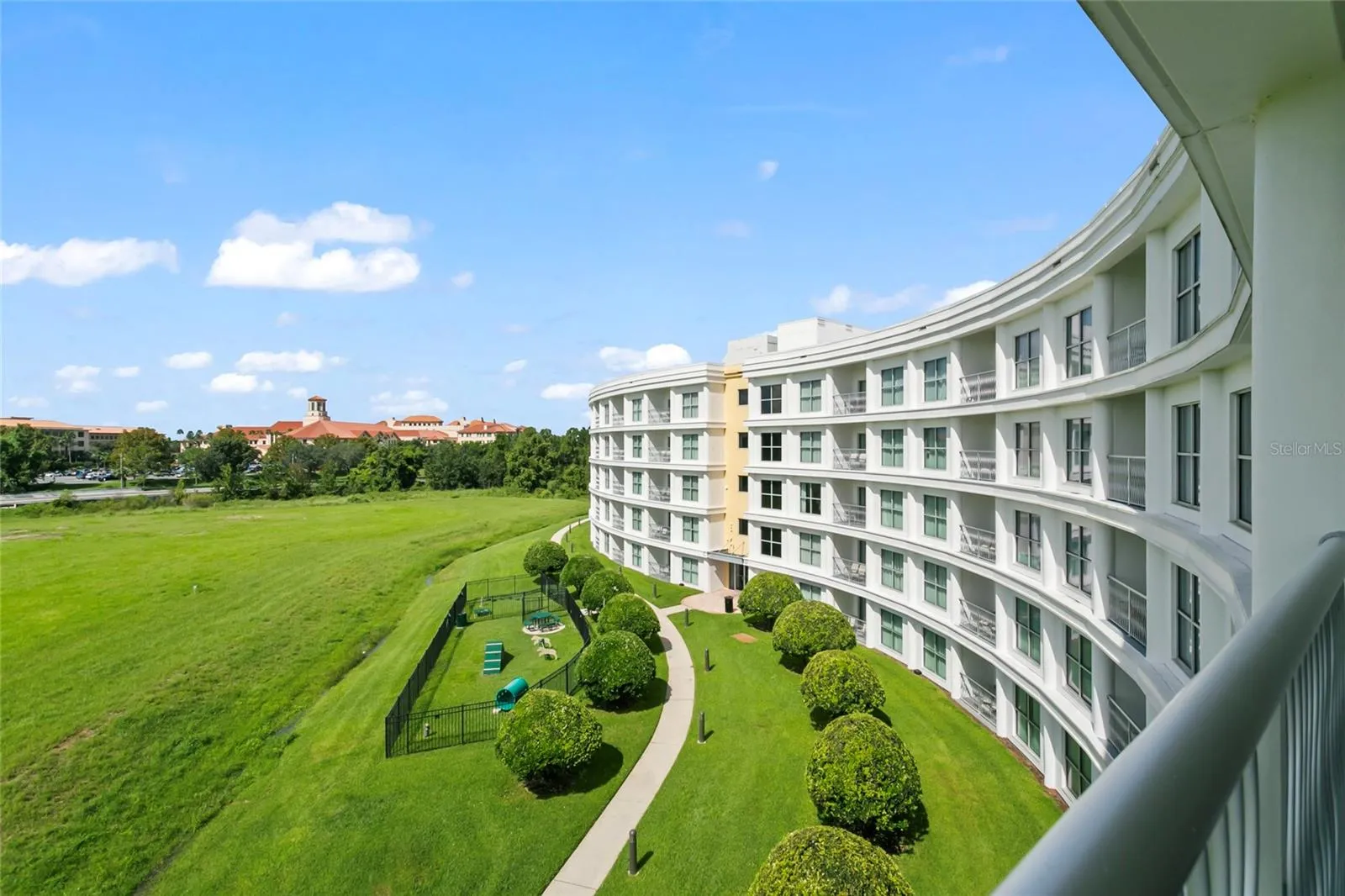 The condo features a spacious, modern floor plan, complete with two private balconies that spectacular views of Celebration and the surrounding areas. Inside, the condo includes a comfortable living room and a kitchen equipped with elegant stainless steel appliances, designed for both style and functionality. The primary bedroom is inviting and includes a bathroom with both a tub and a separate glass shower stall.
