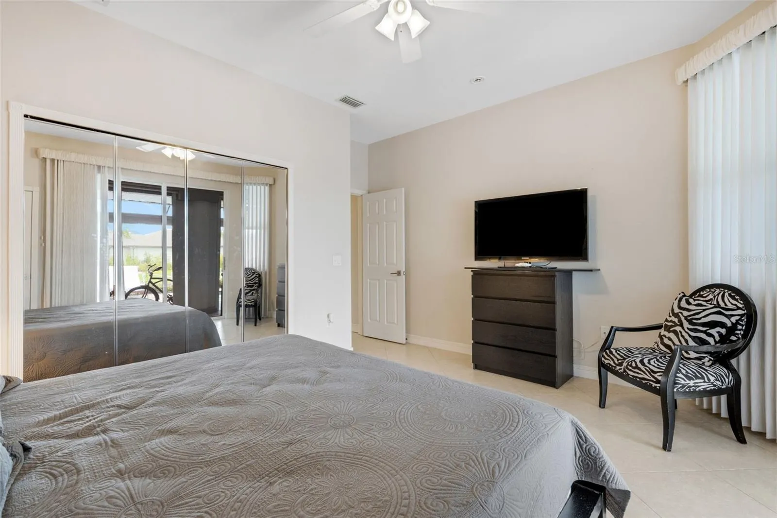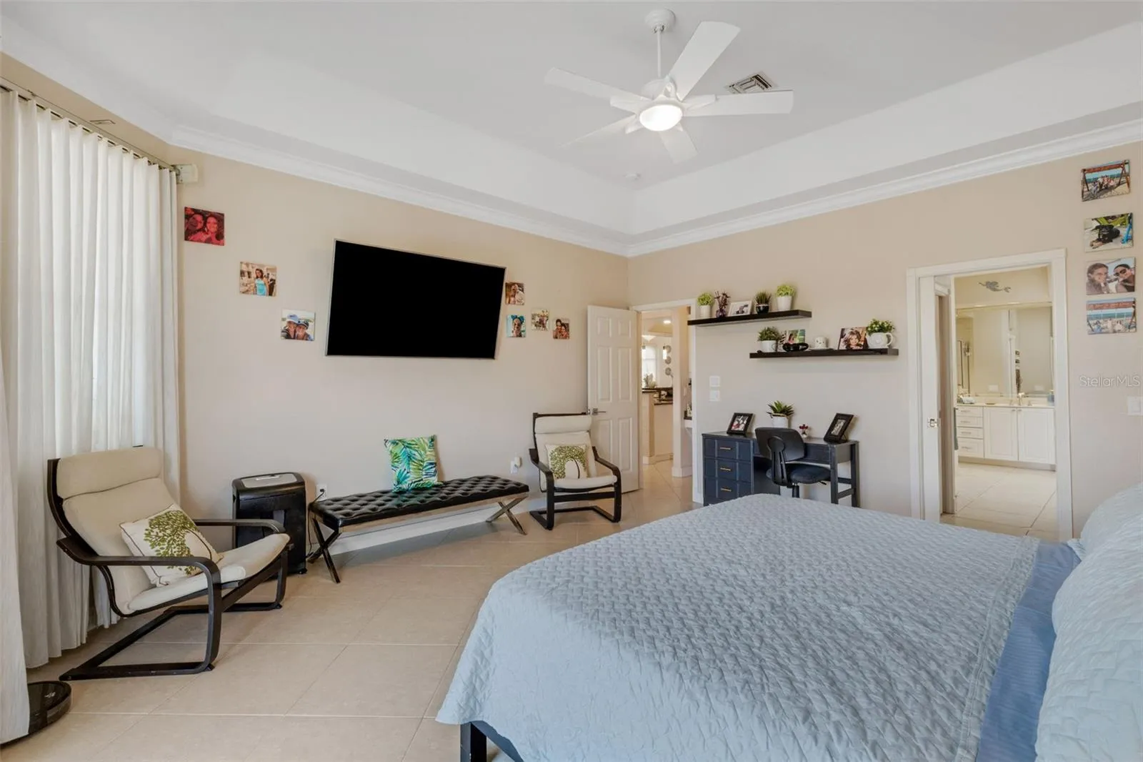 The split-bedroom layout provides privacy and convenience. Retreat to the luxurious primary suite, featuring tray ceilings, private access to the lanai, dual walk-in closets, and an elegant ensuite bath with dual vanities, a water closet, soaking tub, and a separate walk-in shower. The generously sized guest bedrooms also have walk-in closets, high ceilings, and ceiling fans for added comfort.