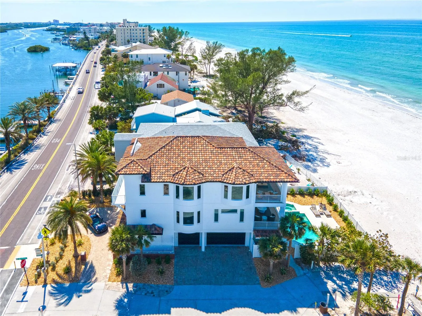 Who says you can’t have it all? This stunning beachfront estate featured in Tampa Bay Magazine with a dock in front of the home and the beach in the back! A real rarity to have both dock and beach with less than one percent of all homes in Pinellas County having this bragging right. Boat and beach in one exquisite estate with all the trimmings including all furniture, lighting, artwork and finishings. Enjoy the best sunsets in town from two massive lanais facing the beach. Enjoy deep water boat slip steps away from your home. This newer (2016) solid block construction home exemplifies true luxury beach living. This barely lived in beach estate boasts over 7,000 square feet (4,490 climate controlled) with 3 stories, 4 bedrooms, 6 bathrooms (4 full and 2 ½), an elevator and all the features befitting a gulf front estate. There is a 6-car air-conditioned garage with custom storage cabinets, a wall storage system. There is a private beachfront heated pool including a spillover spa. The large spectacular kitchen is fully equipped with high-end appliances including 2 Bosch dishwashers, marble counters, 6 burner Wolf Range, a 48” Sub Zero Refrigerator, a convection oven, microwave, and a large walk-in pantry closet. The Imported Miralis custom cabinetry is truly divine. Two oversized islands with Taj Mahal Marble complete this amazing kitchen which is open to the dining and living areas creating one huge entertainment living space. The bathrooms are equally exquisite featuring high-end finishes including Toto bidet toilets, porcelain flooring, and Kohler & Grohe fixtures. The large owner’s bath is fully equipped with a Travertine shower, soaking tub, Private water closet with Toto bidet toilet, and high-end custom vanities. The Owner’s Suite has an oversized custom walk-in closet with cabinetry. The entire exterior has recently been completely re-done including all new pool equipment, fencing, landscaping patio furniture and enlarged backyard. A seating area in the owner’s suite offers a mini bar area with refrigeration. The suite finishes off with beautiful high ceilings and recessed lighting. This home is outfitted with the most exquisite materials throughout. There are two large lanais, one in the living room area and another in the owner’s suite. The gulf front breezes and sunsets are among the best on the beach. A magnificent Pebble Tec pool and spa with custom tile and LED lighting and waterfalls. It is equipped with an elevator servicing all three floors, high-impact windows and sliders, remote controlled electric storm screens, custom electric window treatments, gas generator, security system and intercom. This home is for the discerning buyer who wants the best beach living. This beachfront estate offers full turnkey including brand new luxury furniture throughout and two brand new Bosch HVAC 18 Seer Air Conditioning Systems installed June 2024. All new pool equipment installed in Jan 2025. The landscaping has recently been re-imagined to include all new plantings and fencing. The backyard has been enlarged to take in spectacular gulf views from the pool. Fast Closing available- Enjoy the Beach & Boating right away- Home Move in Ready. Bring your toothbrush and fulfill your dreams.