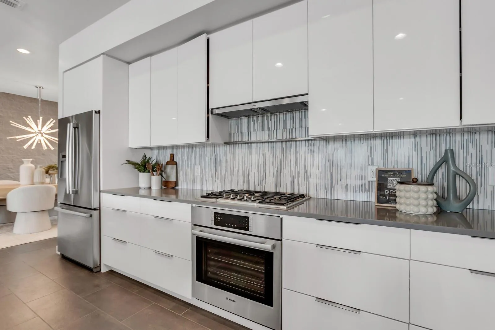 Kitchen has all Bosch stainless steel appliances and imported Italian marble backsplash with modern white euro cabinets.
