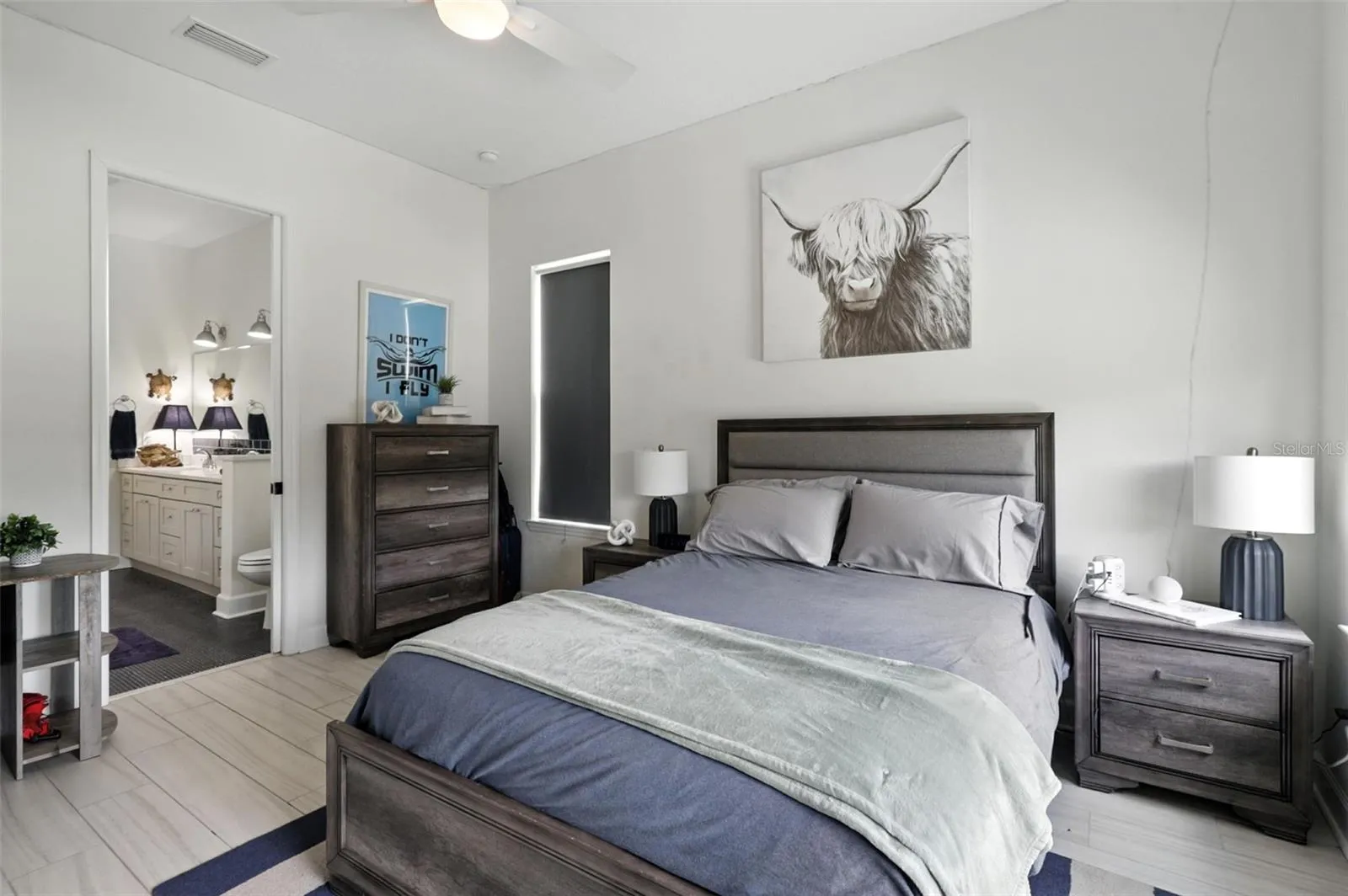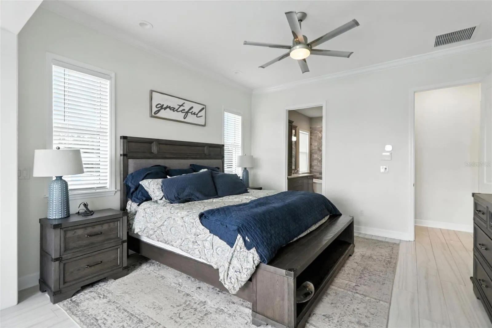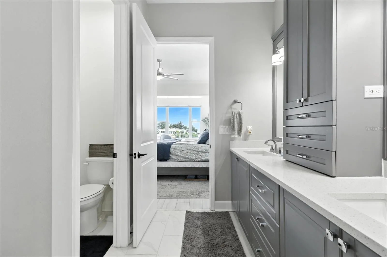 The primary suite is a serene retreat with panoramic water views, while guest bedrooms are