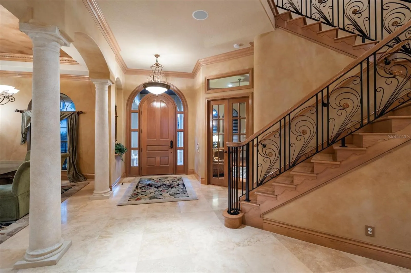 Elegant Italian Style Villa home with paved courtyard enclosed by decorative wrought iron gate. Welcome to 841 Ponce de Leon Drive – a Waterfront Estate in Tierra Verde where elegance meets ease! This architecturally stunning home is fully furnished and move-in ready with 5 bedrooms and 7 full baths. It blends high-end design with thoughtful functionality for the discerning professional or family seeking an elevated coastal lifestyle. Positioned along the Grand Canal, this home is only minutes away from waterfront restaurants, marine services and the Gulf.