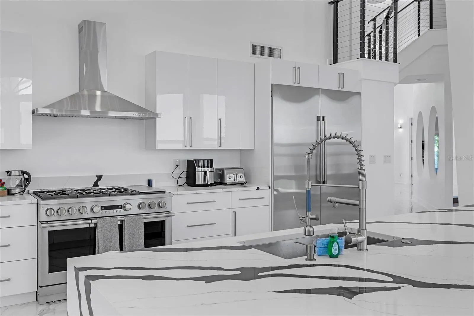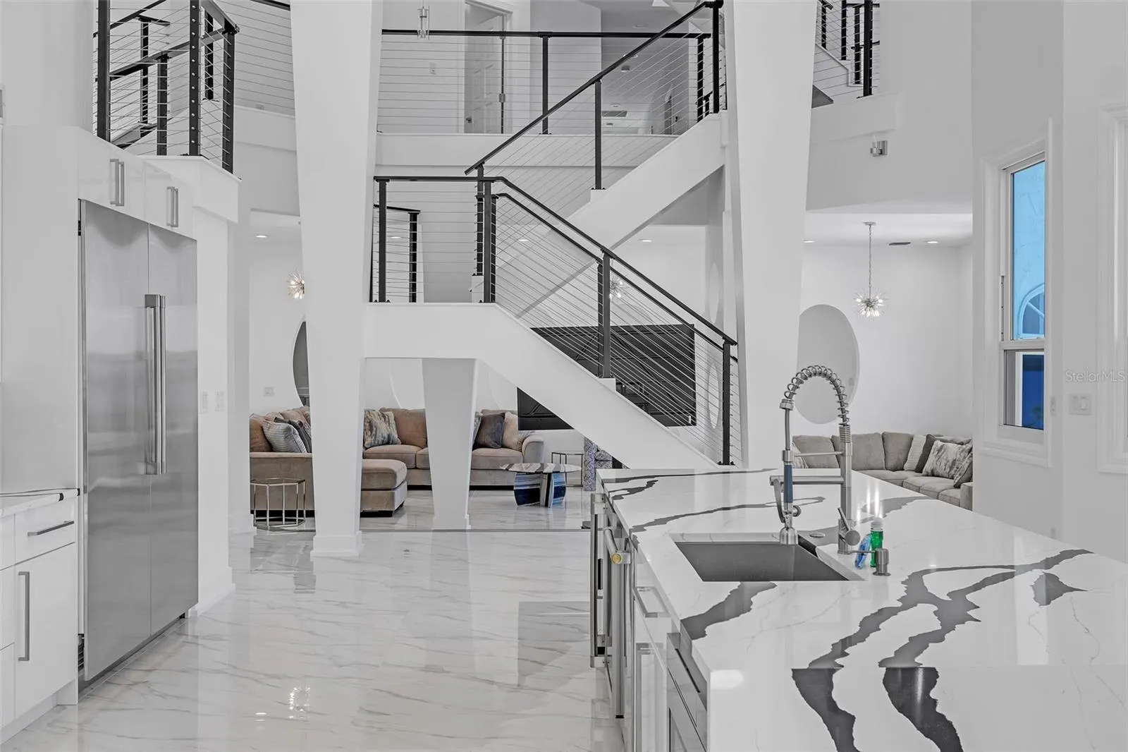 Completely reimagined in 2023, this multi-level modern masterpiece features every high-end upgrade imaginable—including a brand-new Spanish tile roof, hurricane-impact windows and doors, custom Italian flooring, and designer fixtures throughout. The striking open-concept floor plan is anchored by a dramatic grand staircase and soaring ceilings, creating a stunning setting for both everyday living and stylish entertaining.