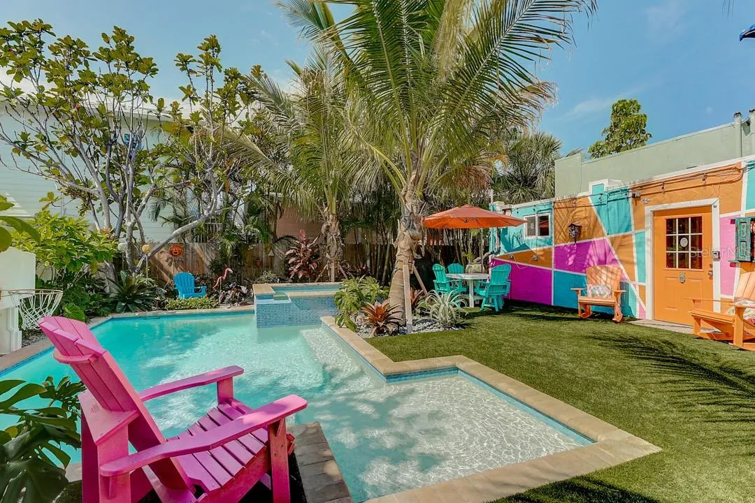 Outside, enjoy a heated inground pool and spa (hot tub) surrounded by privacy fencing, offering a relaxing atmosphere for guests or clients. The home has been extensively renovated top to bottom, including all new luxury vinyl plank flooring, subfloor, drywall, cabinetry, shelving, countertops, appliances, updated electrical, plumbing, and HVAC systems, windows, interior doors, vanities, a refinished tub, washer/dryer, new gravel driveway, and new pool equipment. Even the beach gear is new!