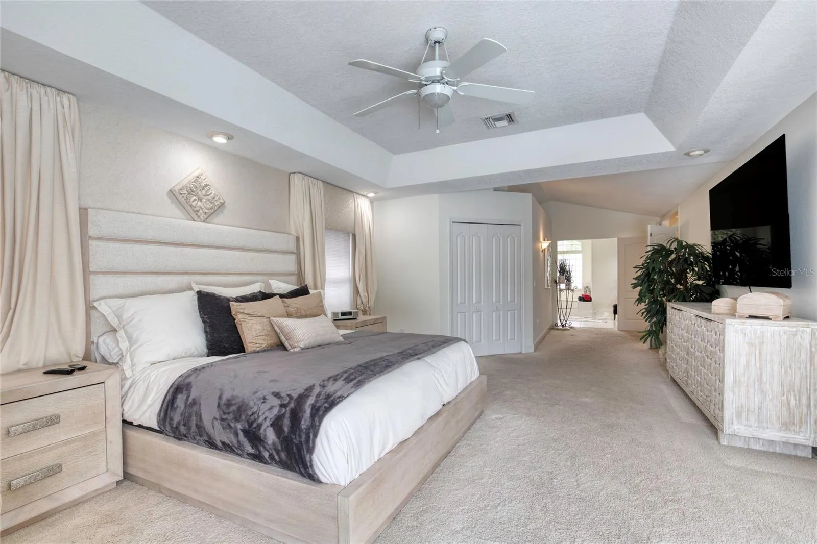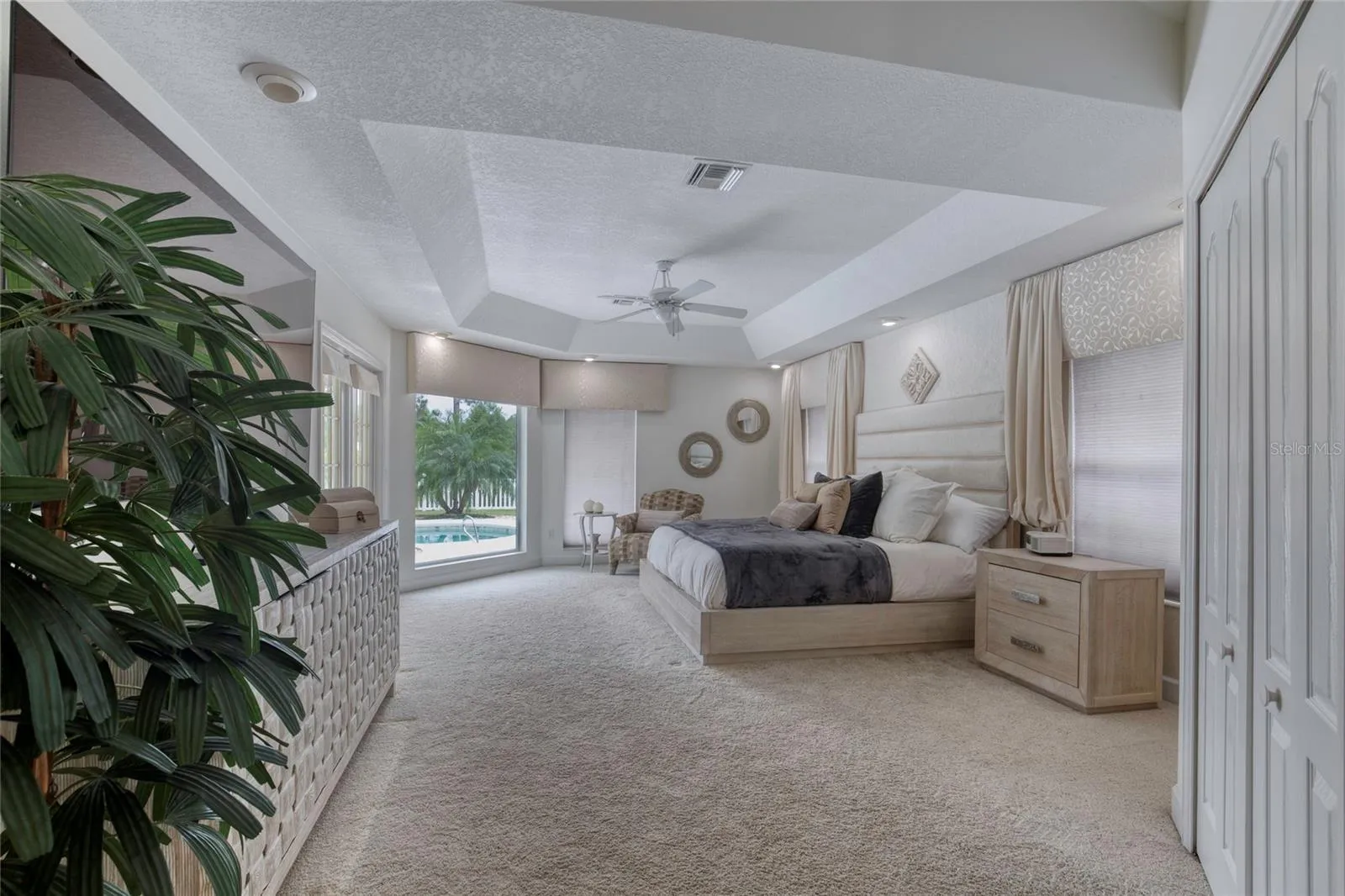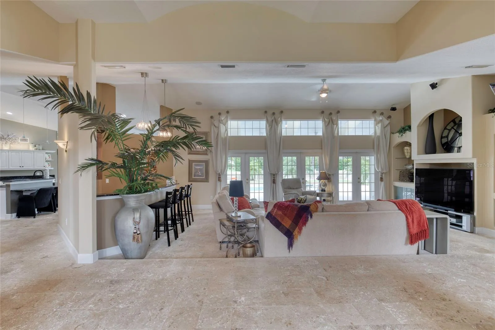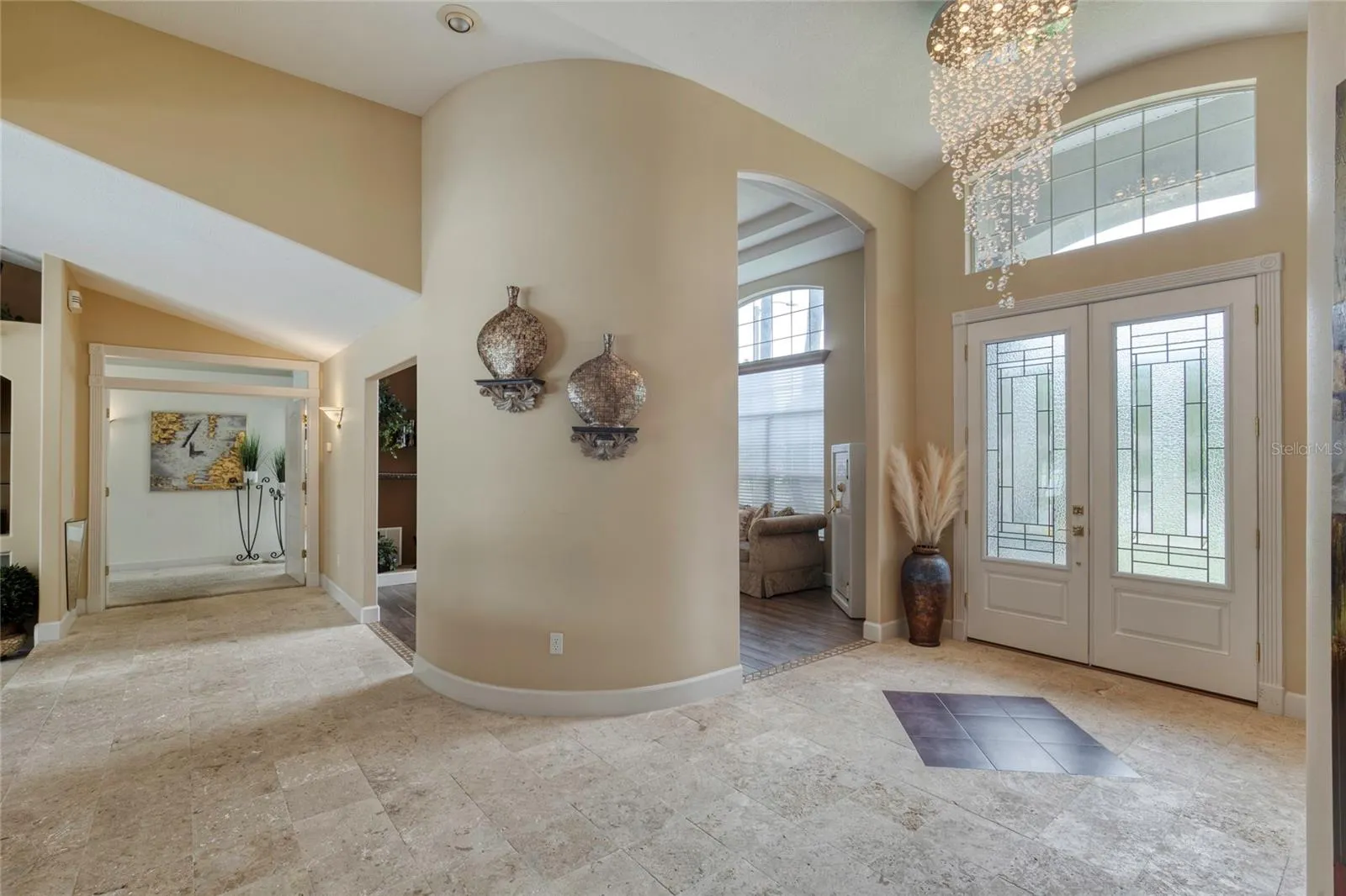 Welcome to 7 Foxford Chase, a spacious Lakefront Estate Home in the sought-after Hunters Ridge community of Ormond Beach. This 4-bedroom, 2 Full and 2 half Bathroom pool home sits on a large almost 1/2 Acre lot with a tiled roof, long driveway for plenty of extra parking, and 2-car garage. Step through the New Lead Glass double doors into a thoughtfully designed interior with amazing upgraded features . Vaulted ceilings throughout the living areas up to almost 13 ft. To the left is the formal dining room, and to the right, a formal living room perfect for additional seating or entertaining. Straight ahead, the sunken living room features three sets of French doors leading out to the lanai, and a built-in bar with glass cabinets, wine rack, sink, and mini fridge—ideal for hosting.