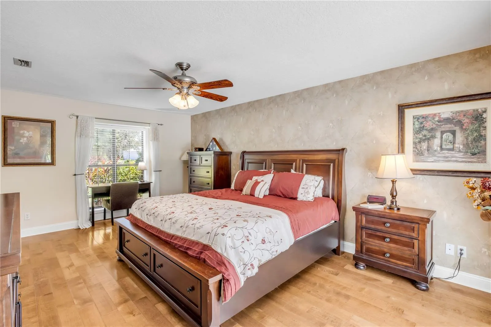 Inside, you’ll be greeted by rich Maple wood floors that flow throughout the main living areas. The gourmet chef’s kitchen is the heart of the home, featuring granite counters, copious oak cabinetry, a cooking and eating island, dining nook with wet bar, and plenty of room to gather. The open living area with wood-burning fireplace and Magnificent Maple flooring throughout offers warmth and comfort, while sliding doors lead to a private deck with sweeping golf course views, perfect for heckling your friends on the fairway.