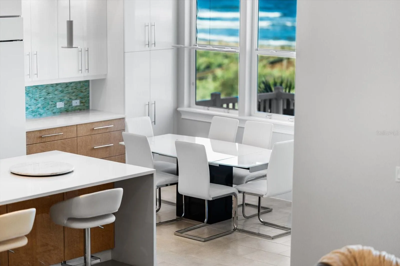 The lower level boasts two-bedroom en suites, a spacious entertaining area, and a laundry room, ideal for guests or extended family stays. On the second floor, an open-concept main living area and chef’s kitchen take center stage, offering panoramic Atlantic views. The kitchen boasts solid custom cabinetry, a coffee bar, secondary sink, and a spacious pantry, with sliding glass doors leading to a screened balcony perfect for entertaining. Front and back balconies on the second and third floors are ideal for enjoying stunning sunrises and sunsets, while a den or flex room on each level adds versatility to the space.