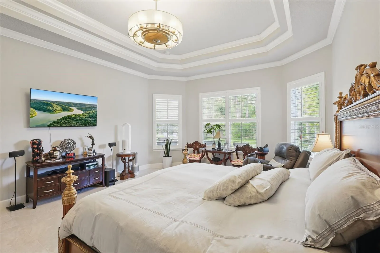 The living room, a masterpiece of design, boasts a soaring 13′ ceiling with tray accents, surround sound, and remote-controlled blinds that frame a stunning 4-panel pocket slider with impact glass. This opens to an outdoor living sanctuary where sophistication meets nature: an outdoor kitchen, paver fire pit, ceiling fans, recessed lighting, and outdoor speakers create an entertainer’s paradise, enclosed by a sleek black wrought iron fence and accented with gutters for seamless style.