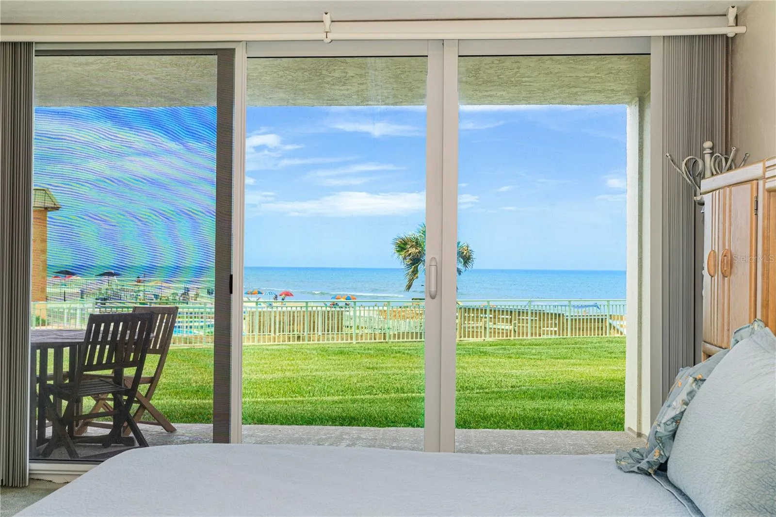 Experience unparalleled luxury at The Peninsula Condominium, an oceanfront gem in Daytona Beach Shores, voted the best condo building in the Shores for 2022, 2023, and 2024. This stunning first-floor, furnished 2-bedroom, 2-bathroom residence offers breathtaking Atlantic Ocean views from the primary bedroom and living room, complemented by all hurricane-impact windows and sliding doors. Step into an open concept living/dining room combo with a kitchen breakfast bar, pantry, in-unit laundry, and spacious bedrooms. Walk out your sliding doors to a large patio enveloped by a lush green lawn, perfect for relaxation.