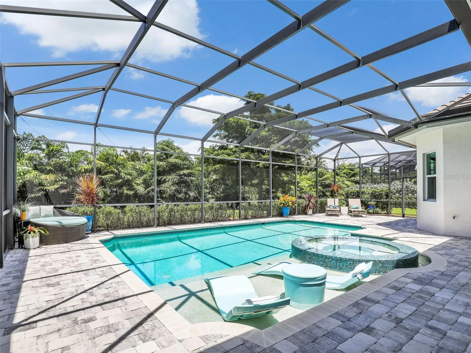 An exceptional opportunity in Hidden Harbor—one of Southwest Florida’s most exclusive boating communities—this meticulously maintained pool and spa home offers luxury living without the premium of a waterfront lot. Built in 2017 by award-winning Stock Development, this home features high-end finishes and quality craftsmanship, all set on a private, landscaped backyard that provides both serenity and value. Inside, enjoy 12-foot ceilings, elegant details, designer lighting, and neutral-tone porcelain tile in the main living areas. The chef’s kitchen is equipped with quartz countertops, a large island, natural gas cooktop, and an LG French Door Smart Refrigerator with Craft Ice. The floor plan includes three spacious bedrooms, a den with engineered hardwood flooring that can function as a fourth bedroom or office, and a flexible dining area that could be enclosed if desired. The primary suite offers peaceful views of the pool, dual custom walk-in closets, and a spa-like bath with soaking tub, walk-in shower, and raised dual vanity. One guest bedroom includes a built-in walk-in closet, and the other features a spacious closet with pocket doors. The guest bath offers a raised vanity and a tiled tub/shower combo. A large laundry room with a utility sink and built-in cabinetry adds convenience. Outdoor living is a highlight, with a screened lanai, gas-heated pool and spa, auto-fill system, one-touch automation, and brick paver deck. The covered space is pre-plumbed for a future outdoor kitchen and surrounded by lush landscaping for ultimate privacy. Additional features include impact windows and doors, a tile roof, and an epoxy-coated garage with custom storage, including motorized overhead racks and bike mounts. Hidden Harbor is a gated, 55-acre community with only 77 homes, offering a peaceful setting and fabulous location. Amenities include a clubhouse with kitchen and social space, resort-style pool, outdoor kitchen, fire pit, kayak launch, and community dock. Natural gas and all landscaping are included through the HOA, making this a low-maintenance, high-luxury lifestyle near RSW Airport, HealthPark, and Gulf Coast Medical Center.