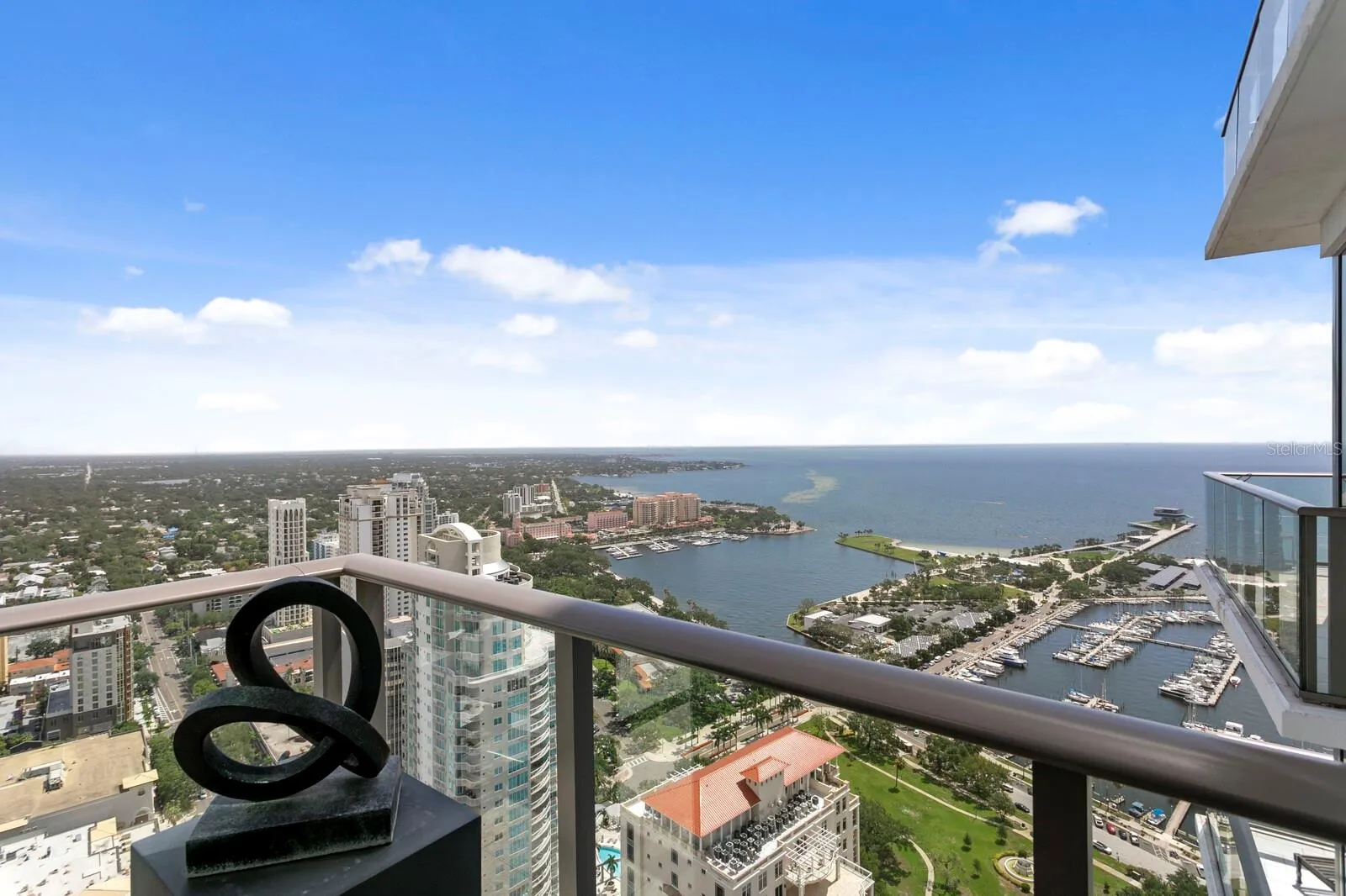 UNPARALLELED PENTHOUSE SANCTUARY | THE SKY COLLECTION AT THE ONE IN DOWNTOWN ST PETE | This is not merely a residence—it’s a statement. Exclusively crafted by combining two premium units during the building’s construction, this extraordinary penthouse represents the pinnacle of luxury living in downtown St. Petersburg. Perched on the 39th floor, this one-of-a-kind sanctuary offers the most coveted panoramic views of Tampa Bay through floor-to-ceiling windows that frame the endless horizon. This residence lives like a single family home with 11’ ceilings and amenities that you would only typically find in a home. Culinary Excellence Redefined | The chef’s kitchen stands as a masterpiece of form and function, featuring an oversized waterfall island with stunning 2.5-inch Sapienstone countertops that flow seamlessly into a matching backsplash. Exquisite imported NAC-crafted cabinetry provides both beauty and superior functionality throughout. Every detail has been meticulously considered: Jenn-Air double panel refrigerators, a Jenn-Air Euro Style Series double oven, a premium Rohl sink, and a full butler’s 2nd kitchen that can be completely hidden from the main living area which also has its own private entrance for easy catering and deliveries. The sophisticated bean-to-cup Miele coffee machine and built-in Miele wine refrigerator positioned perfectly off the dining area ensure effortless entertaining at the highest level. Master Suite Wellness Sanctuary Retreat | Take in your private haven featuring soaring high ceilings and an oversized master closet with custom cabinetry expertly crafted by California Closets and NAC, creating a sophisticated storage solution that rivals the world’s finest boutiques. The spa-inspired master bath becomes your personal age-rejuvenation center with dual vanities featuring premium Grohe fixturing, a luxurious soaking tub, and an oversized shower complete with a Steamist steam system and a unique built-in cold plunge tub. This extraordinary combination of therapeutic heat and invigorating cold therapy offers the ultimate in wellness and anti-aging benefits, creating your private longevity sanctuary. The Kohler smart toilet reflects the attention to innovative luxury throughout. Unmatched Privacy & Outdoor Living | As the building’s only recessed unit, this penthouse provides an unparalleled sense of privacy and exclusivity. Rollease Acmeda motorized shades with remote controls offer effortless light control while maintaining those stunning vistas. The expansive 600-square-foot wrap-around terrace—the largest in the entire building—becomes your private sky deck, complete with curated designer furnishings and an elegant fountain, creating an outdoor oasis suspended above the city. Sophisticated Living Spaces | Every room showcases globally-sourced designer furniture, finishes, fixtures, including 3 stunning Murano chandeliers. A premium Sonos sound system provides seamless audio throughout, while four Samsung Frame TVs blend technology with aesthetics. Refined Guest Accommodations | Guest bathrooms showcase elegant marble flooring and feature Villeroy & Boch commodes with premium Grohe fixturing, ensuring every visitor experiences the same level of luxury. Turnkey Luxury | Available partially furnished with select exclusions, this residence allows you to simply arrive and begin living at the highest level. This is more than a home—it’s your signature in the sky.