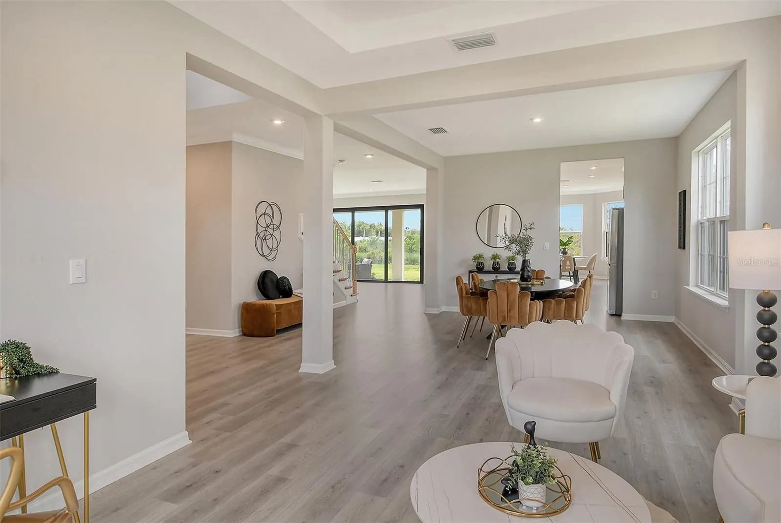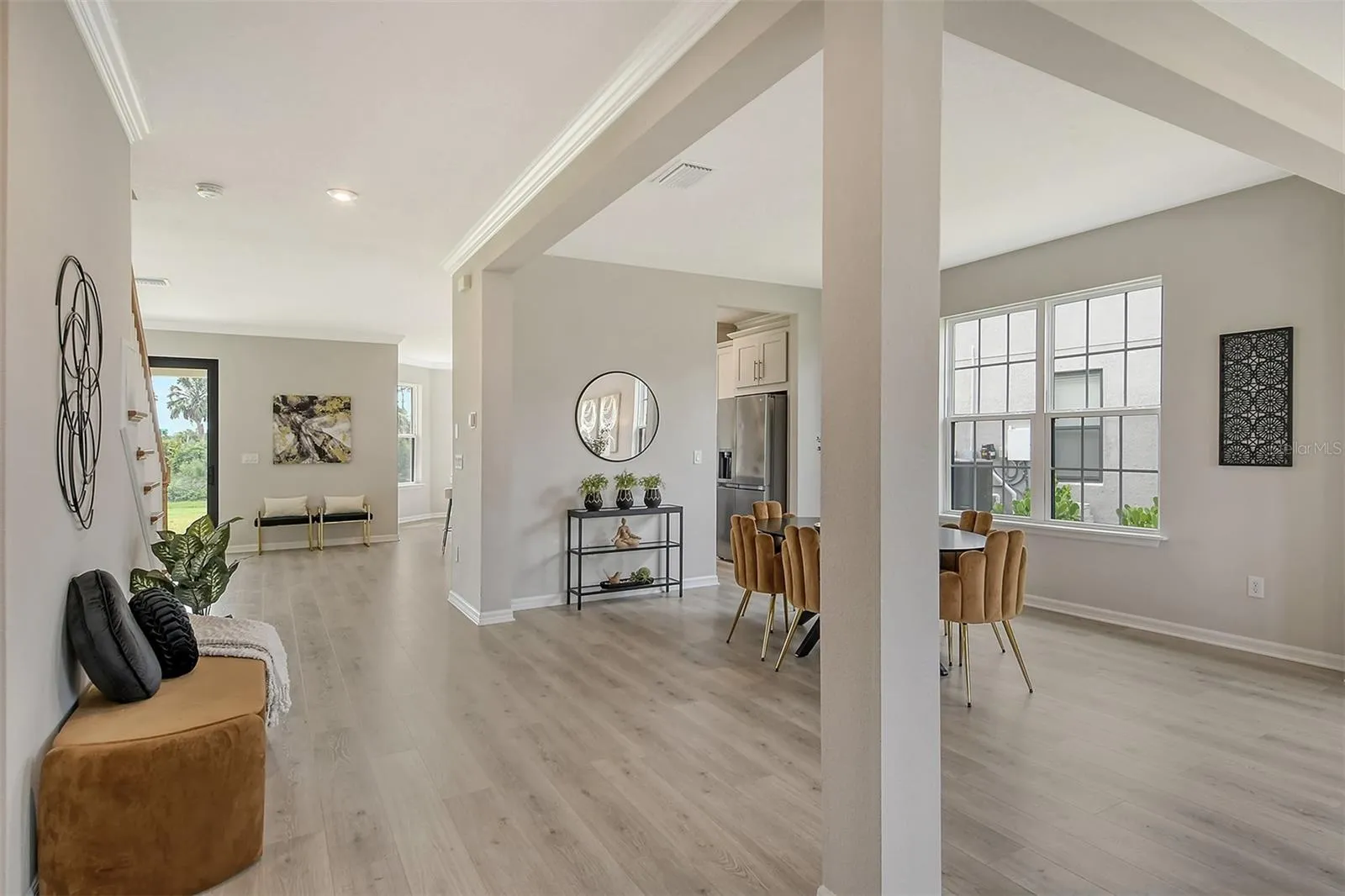 Natural light enhances the open living spaces, highlighted by crown molding, upgraded laminate flooring, and impact-rated sliding glass doors overlooking the preserve. The kitchen features a large island with added storage, a double-door pantry, two-tone cabinetry, and upgraded fixtures.