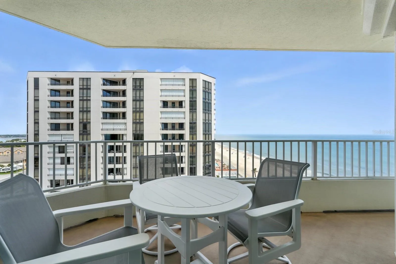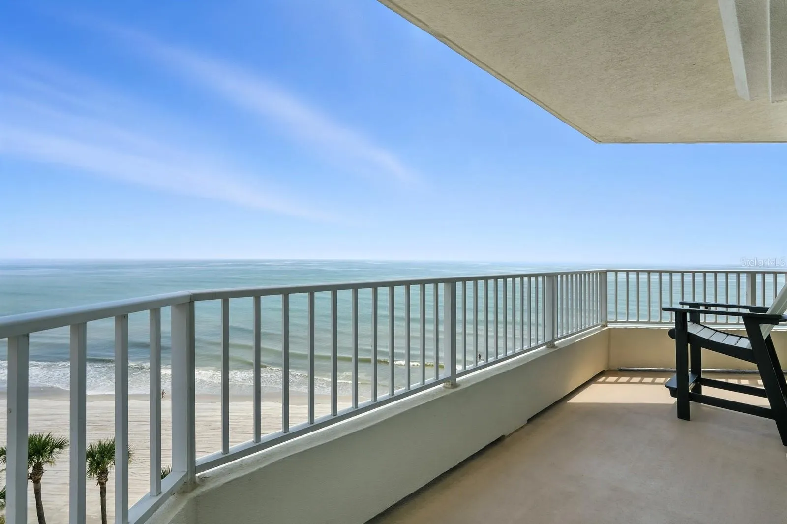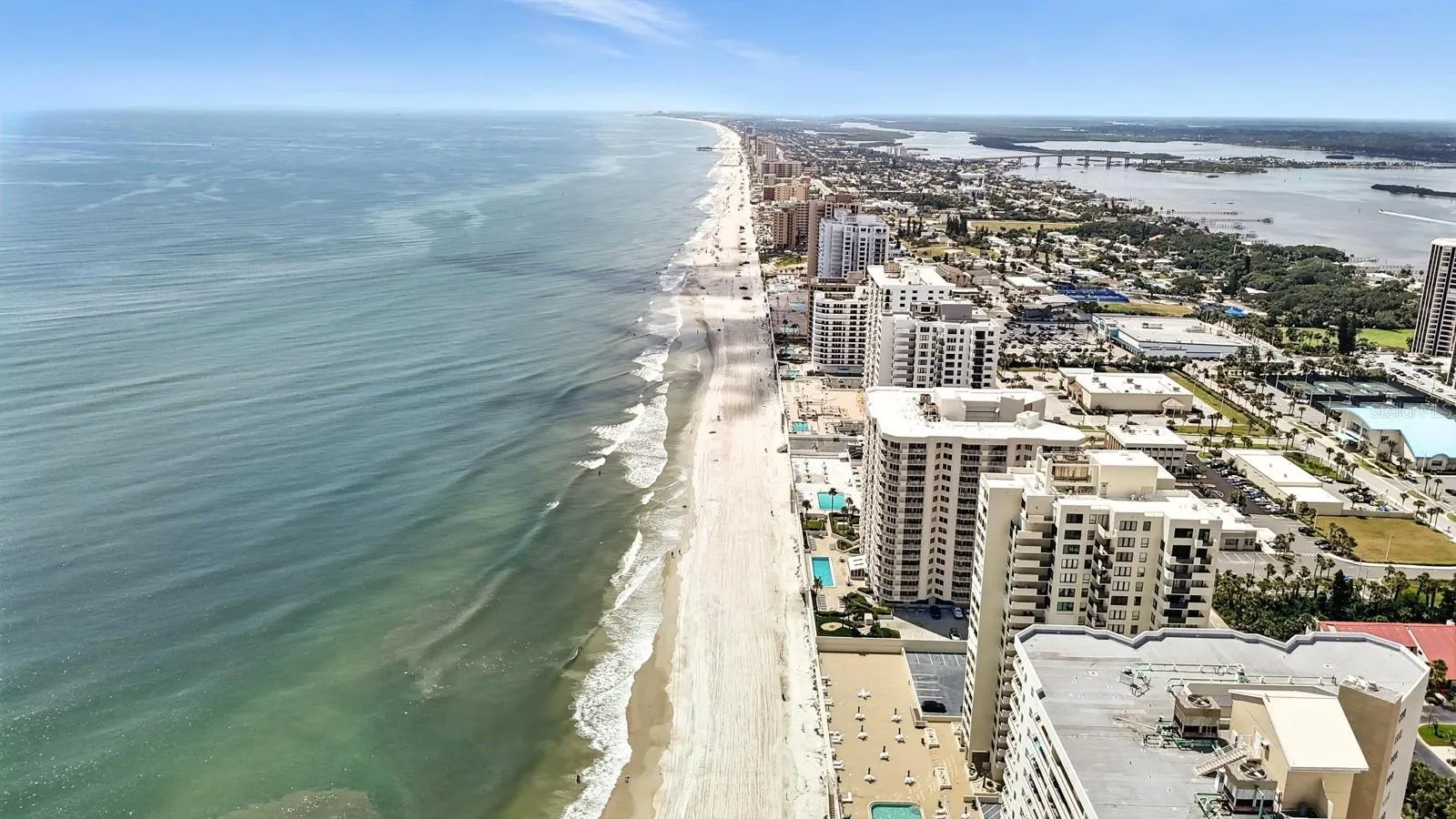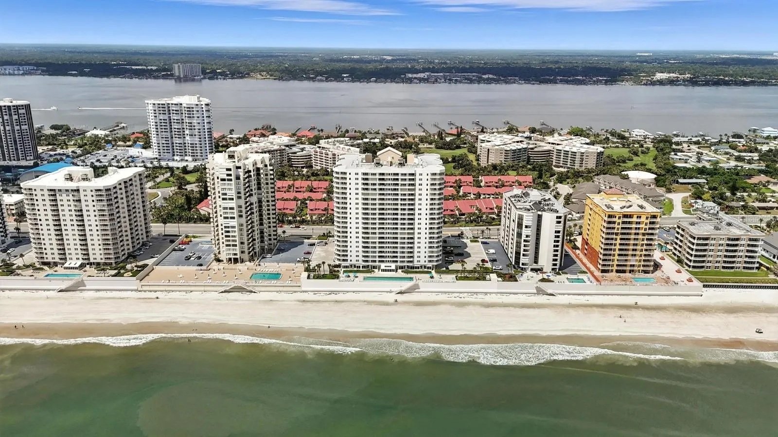 FULLY RENOVATED and FULLY FURNISHED 3BR/2BA OCEANFRONT CORNER UNIT in the coveted 03 stack at Oceans Eight! This luxurious showpiece offers panoramic OCEAN-TO-RIVER VIEWS from impact-rated turtle glass windows and a wraparound balcony—perfect for watching sunrises, sunsets, rocket launches, fireworks, and dolphins. Designer kitchen with soft-close cabinetry, porcelain countertops, and stainless appliances flows into an open living space finished with elegant 24×24 polished tile floors and oversized baseboards. Spa-style bathrooms feature floor-to-ceiling designer tile and rain showers. NEW ELECTRIC HURRICANE SHUTTERS (2025) add convenience and peace of mind. Resort-style amenities include an oceanfront pool, heated indoor lap pool, spa, sauna, and fitness center. PET-FRIENDLY with secured parking and storage. Walk to Publix, golf, pickleball, concerts, and more—LUXURY COASTAL LIVING AT ITS FINEST! Oceans Eight is widely regarded as one of the finest buildings in Daytona Beach Shores, offering premium amenities and meticulous upkeep. The lobby and social room renovations are fully funded with NO ASSESSMENTS to buyers. Residents also enjoy a car wash station, bike storage, assigned underground parking, and additional surface parking. Centrally located for easy access to beaches, shopping, dining, I-95, and I-4, this rare corner residence combines modern elegance, exceptional views, and walkable convenience in one of Florida’s most desirable coastal communities.