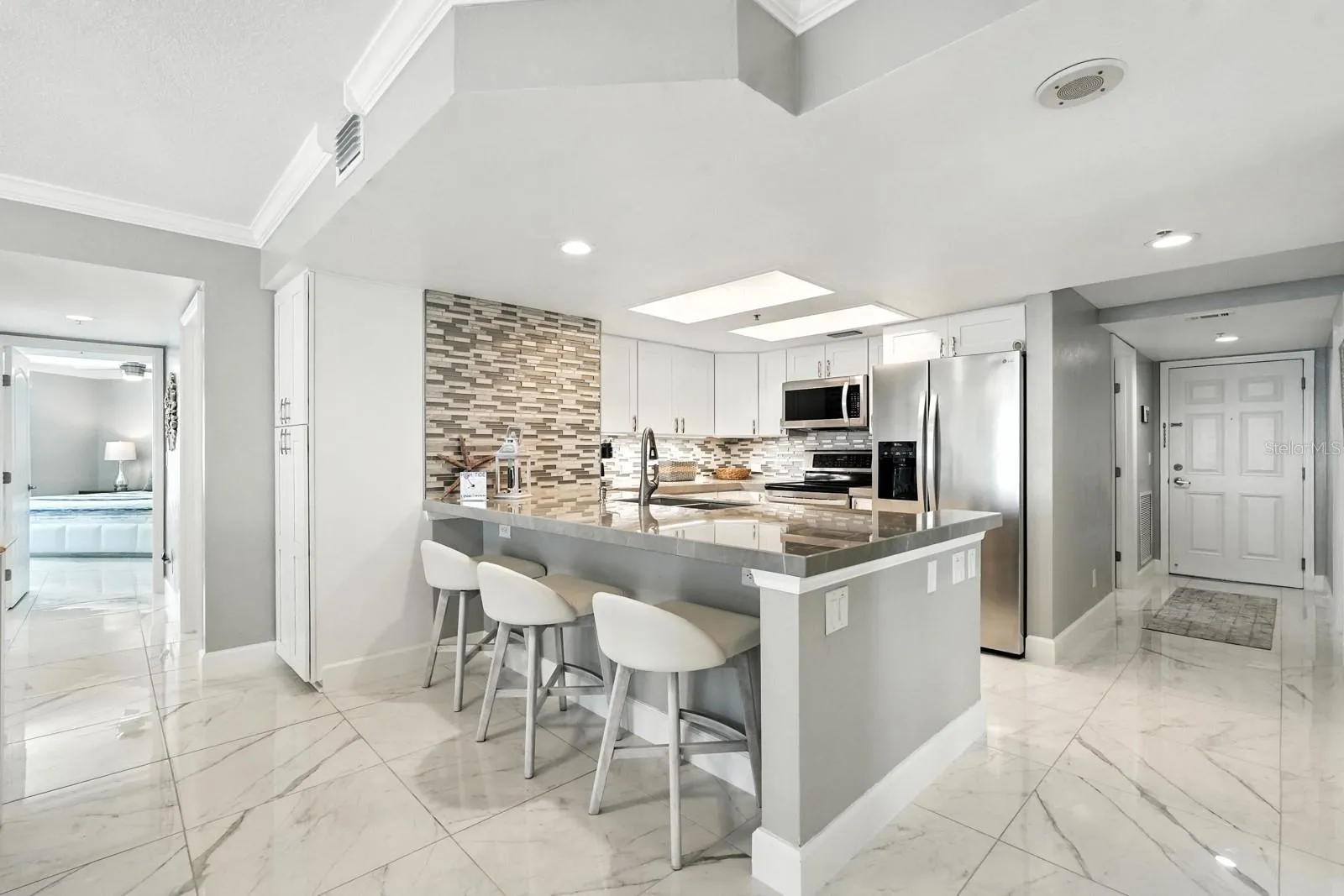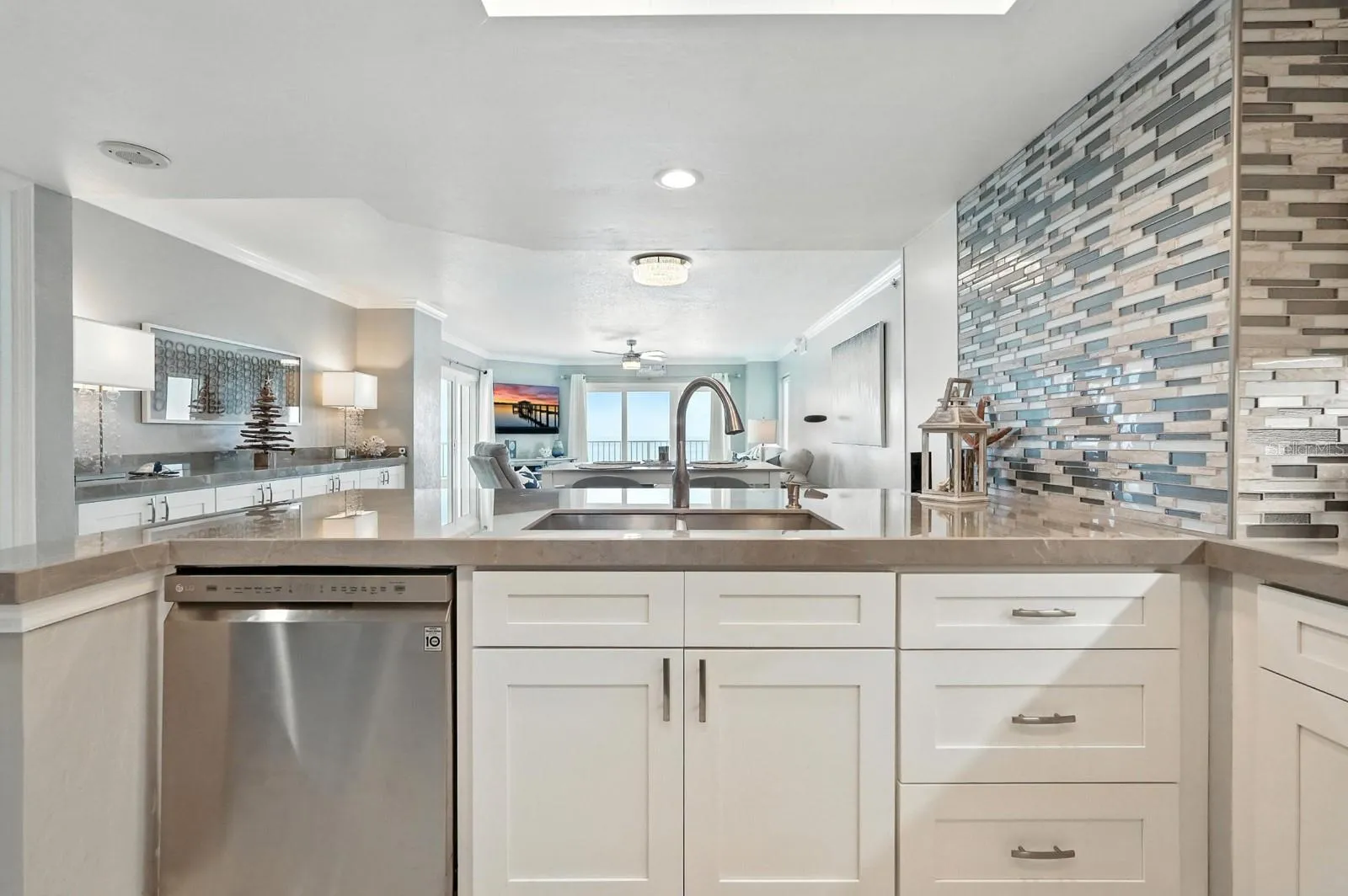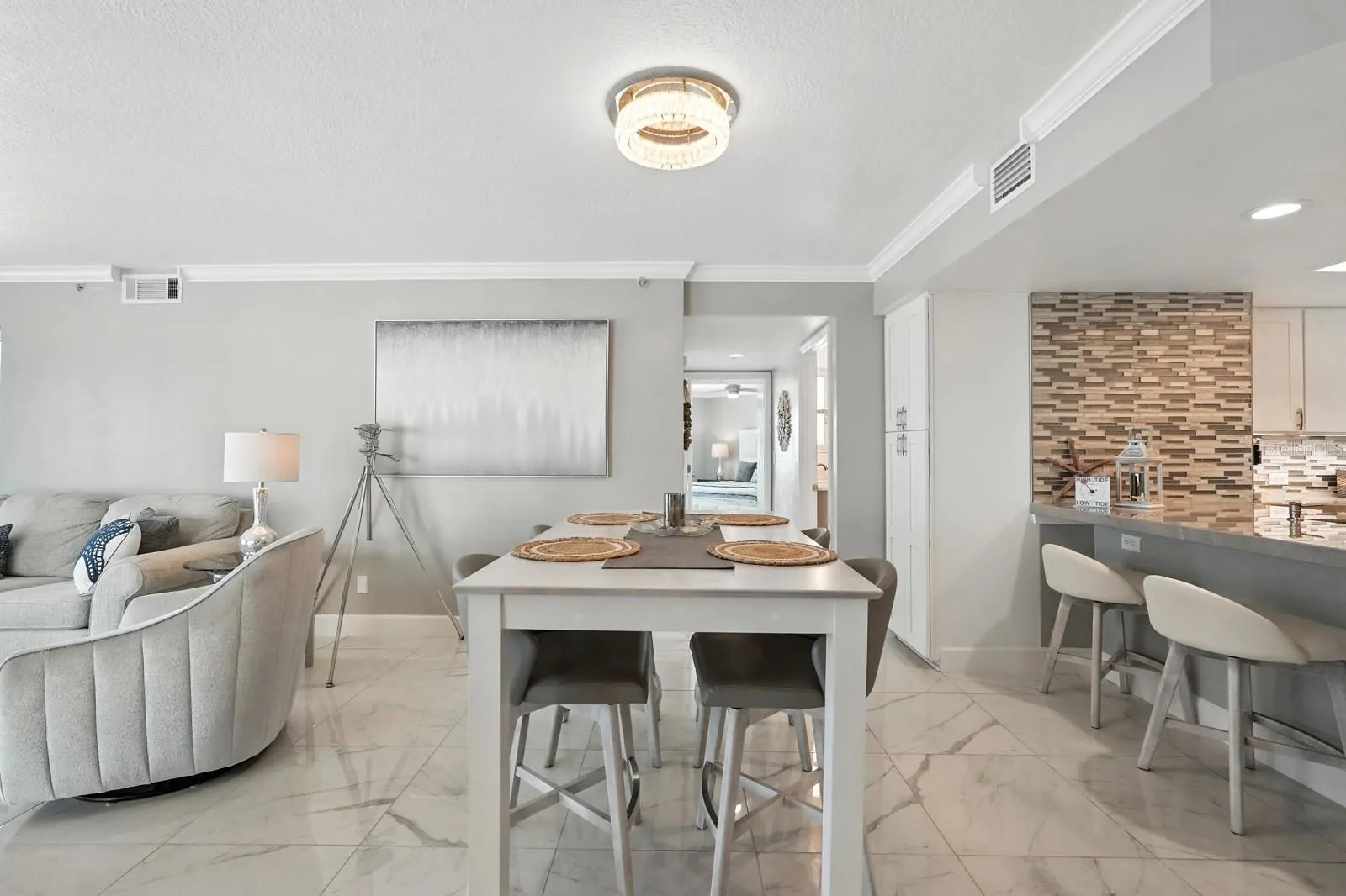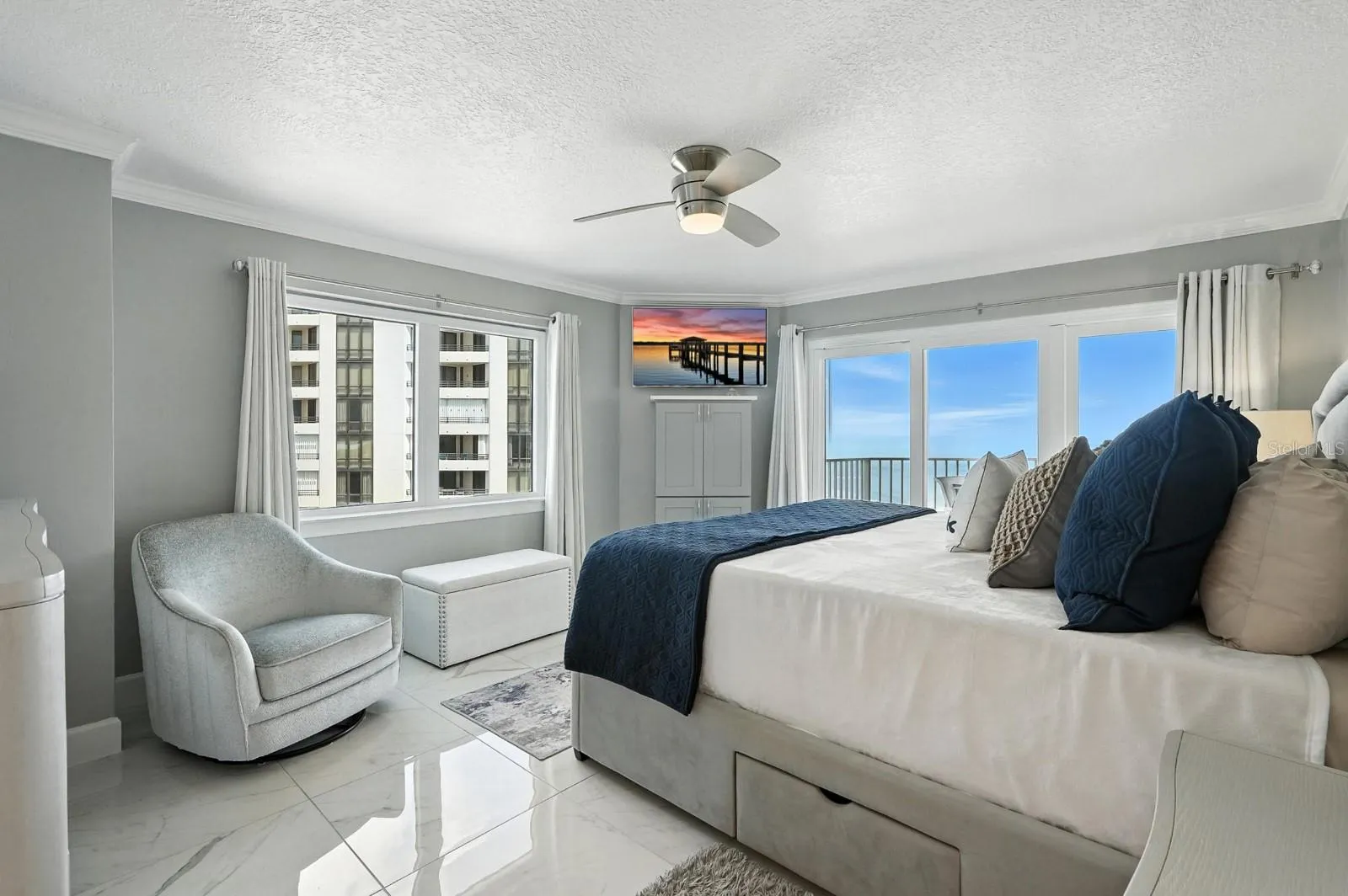 FULLY RENOVATED and FULLY FURNISHED 3BR/2BA OCEANFRONT CORNER UNIT in the coveted 03 stack at Oceans Eight! This luxurious showpiece offers panoramic OCEAN-TO-RIVER VIEWS from impact-rated turtle glass windows and a wraparound balcony—perfect for watching sunrises, sunsets, rocket launches, fireworks, and dolphins. Designer kitchen with soft-close cabinetry, porcelain countertops, and stainless appliances flows into an open living space finished with elegant 24×24 polished tile floors and oversized baseboards. Spa-style bathrooms feature floor-to-ceiling designer tile and rain showers. NEW ELECTRIC HURRICANE SHUTTERS (2025) add convenience and peace of mind. Resort-style amenities include an oceanfront pool, heated indoor lap pool, spa, sauna, and fitness center. PET-FRIENDLY with secured parking and storage. Walk to Publix, golf, pickleball, concerts, and more—LUXURY COASTAL LIVING AT ITS FINEST! Oceans Eight is widely regarded as one of the finest buildings in Daytona Beach Shores, offering premium amenities and meticulous upkeep. The lobby and social room renovations are fully funded with NO ASSESSMENTS to buyers. Residents also enjoy a car wash station, bike storage, assigned underground parking, and additional surface parking. Centrally located for easy access to beaches, shopping, dining, I-95, and I-4, this rare corner residence combines modern elegance, exceptional views, and walkable convenience in one of Florida’s most desirable coastal communities.