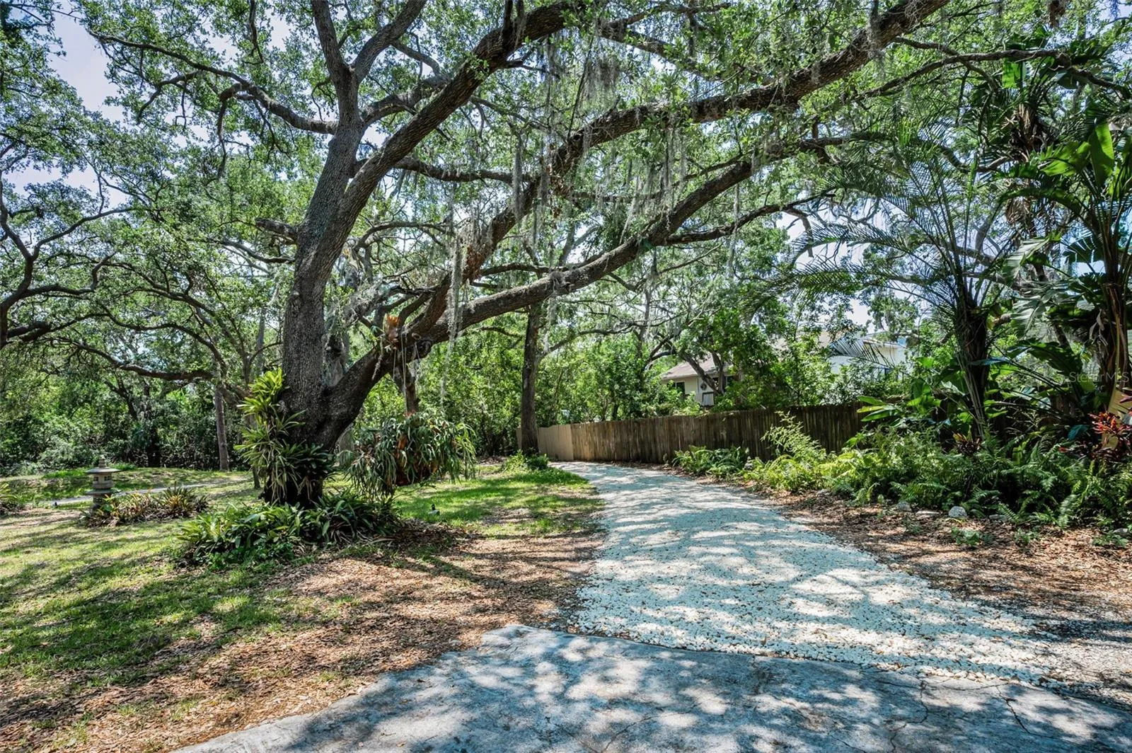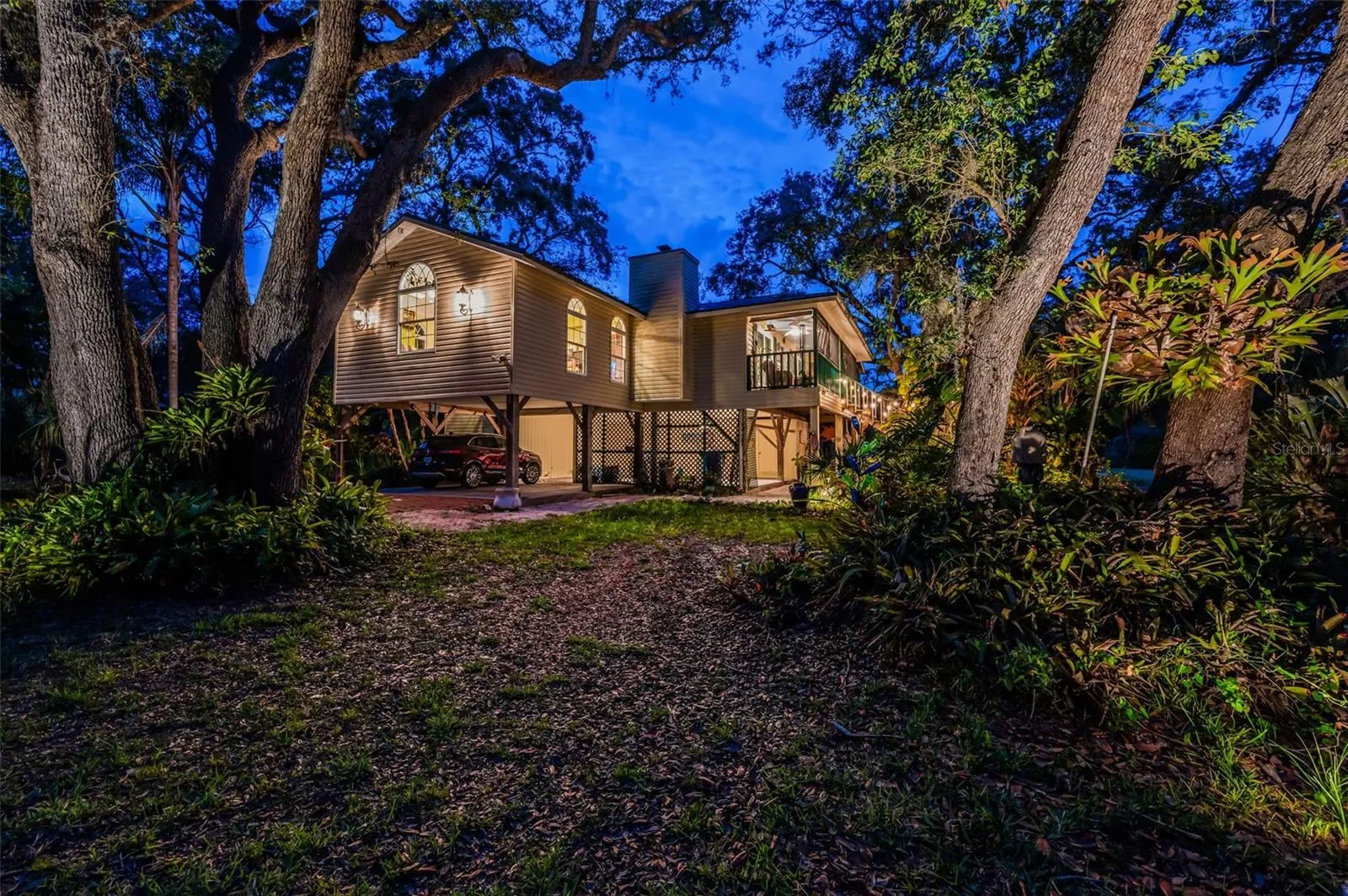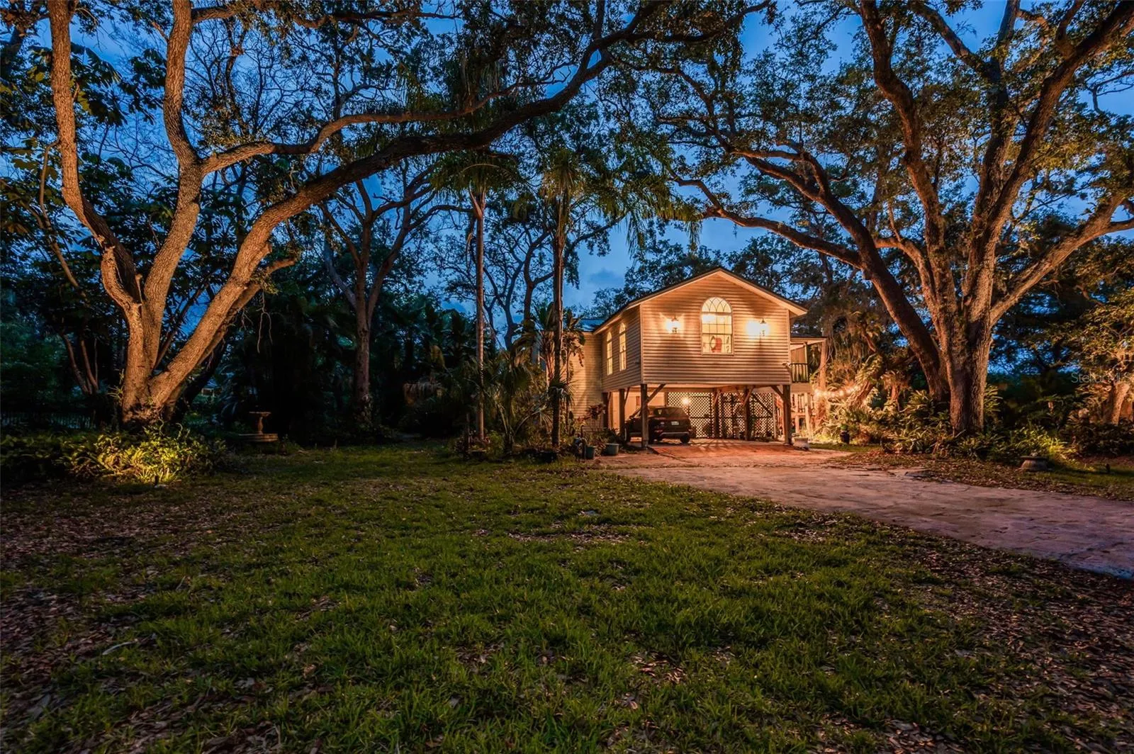 Tucked away in the serene and historic community of Crystal Beach, Florida, this secluded 0.58-acre property offers a rare opportunity to experience coastal living at its finest. Parcel of land is large enough to divide in two. As you journey down the private road, a distinctive metal fish hanging from a tree marks the entrance to this hidden gem. The stone driveway meanders through a lush landscape adorned with majestic century-old oak trees, graced with 8 grand staghorn ferns, and a variety of tropical plants that create a tranquil and inviting atmosphere. Ascending the exterior staircase, you’re welcomed by a spacious wrap-around screened porch, perfect for savoring the gentle coastal breezes and panoramic views. Inside, the open-concept living area features bamboo flooring, a cozy gas-burning fireplace, and a galley-style kitchen with a convenient breakfast bar. The adjacent sunroom, bathed in natural light through its expansive windows and vaulted ceiling, boasts a striking chandelier and can easily serve as a third bedroom, complete with two large storage closets. The generously sized primary bedroom comfortably accommodates king-size furniture and includes a walk-in closet. French doors lead to an en-suite bathroom featuring a walk-in shower and a luxurious slipper tub, strategically positioned to offer tranquil garden views—perfect for unwinding after a long day. Additional amenities include laundry hookups both in a hall closet within the main house and in the carport storage room, as well as covered carport parking for up to three vehicles. The back property line is fenced and offers direct gated access to the Pinellas Trail, ideal for walking, biking, and enjoying the outdoors. Just a short stroll away, you’ll find Live Oak Park, Gulf Shore Park, scenic shoreline walking paths, and a new community pier currently under construction. Crystal Beach is renowned for its laid-back, coastal lifestyle and rich history dating back to the 1900s. Residents enjoy easy access to the Gulf waters, opportunities for kayaking and paddleboarding in calm bays and inlets, and a close-knit community atmosphere. The area’s charm is further enhanced by its proximity to historic Tarpon Springs and Ozona, offering a blend of cultural experiences and natural beauty. With ample space for recreational vehicles and the freedom to personalize your property, this home presents endless possibilities. Whether you’re seeking a peaceful retreat, a family residence, or a unique investment opportunity, this Crystal Beach haven is ready to fulfill your vision. This exclusive property is available by appointment only, with access via a private road. Don’t miss the chance to own a slice of paradise in one of Florida’s most desirable coastal communities. Contact us today to arrange your private viewing. As the locals say, “If you’re lucky enough to live in Crystal Beach, you’re lucky enough.”