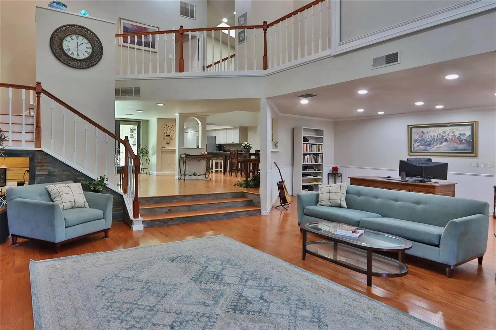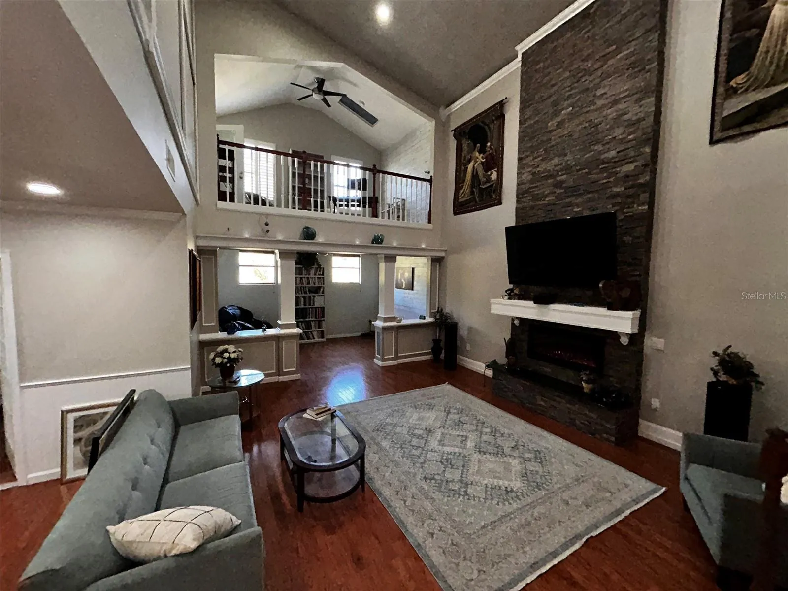 Designed with a modern, open-concept layout, the home features rich hardwood floors, a dramatic two-story stone fireplace, and an abundance of natural light throughout. The stunning office/library/den overlooks the central great room, showcasing architectural detailing and custom moldings that add timeless sophistication. The chef’s kitchen includes granite countertops, stainless steel appliances, and a formal dining room with vaulted ceilings—perfect for entertaining. The thoughtful layout provides three split bedrooms, offering privacy for family or guests. Additional highlights include:
