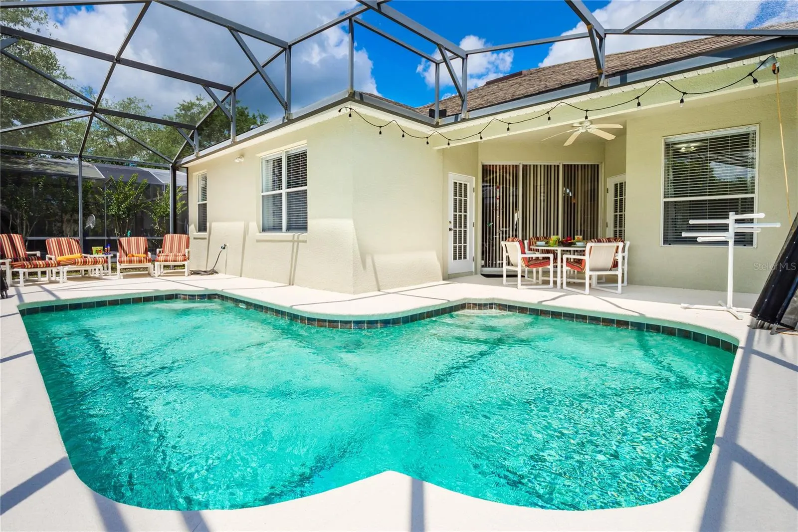 This home offers the convenience of two primary suites. The main retreat includes a walk-in closet and a spa-inspired bathroom with dual vanities, a garden tub, and a walk-in shower. The second suite also boasts direct pool access, creating a private oasis for guests. The outdoor space is a highlight, with a screened-in, heated pool with lighting, all new pool netting (May 2025), and a covered patio—perfect for enjoying Florida living.