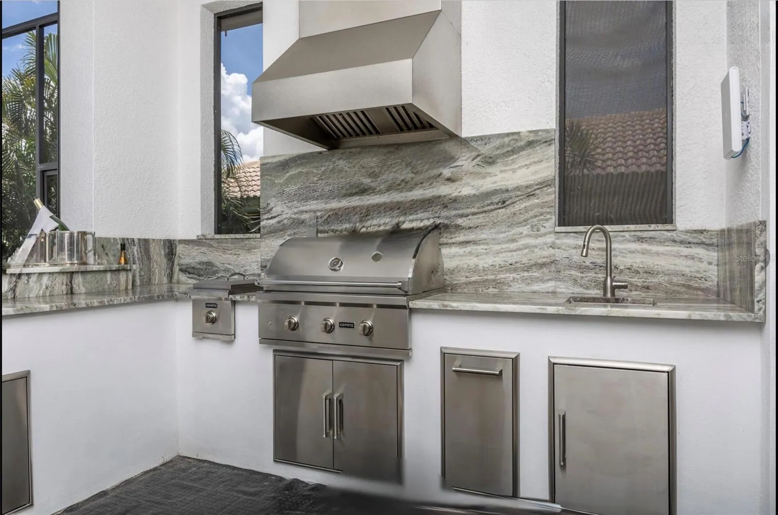 The oversized lanai serves as a true outdoor retreat, featuring a welcoming dining area and a spacious professional outdoor kitchen with Coyote Grill, Flame, extractor hood, wine fridge and air-conditioned drawers, designer outdoor bar chairs.