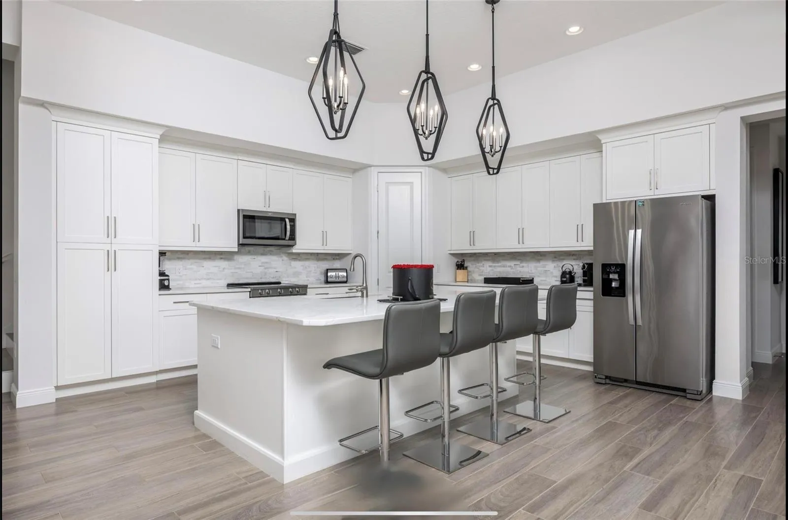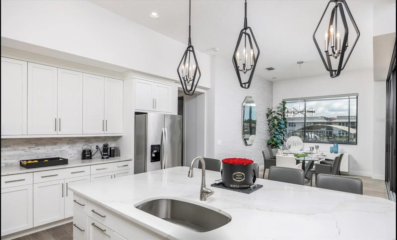 The open-concept design ensures a natural flow between the kitchen, dining area, and great room, where designer lighting and elegant finishes add a touch of sophistication.