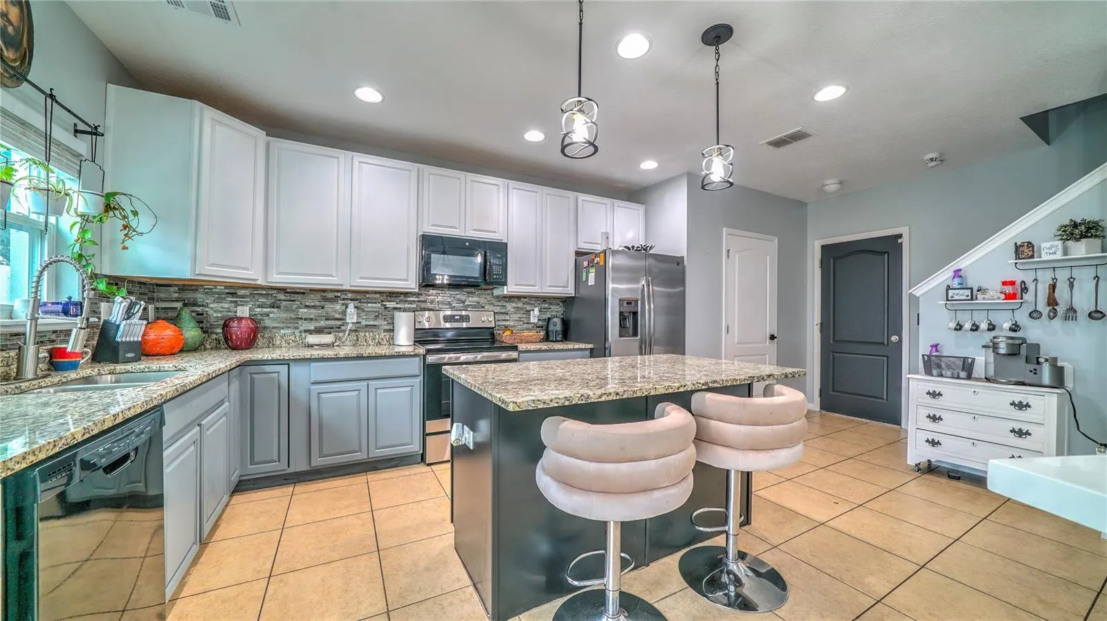 On the main level, you will find an OPEN FLOOR PLAN with a beautiful KITCHEN ISLAND that opens into the gathering room. The UPGRADED KITCHEN includes BLACK APPLIANCES, WOOD CABINETS, AND ELEGANT GRANITE COUNTERTOPS. Tile flooring runs throughout the main living areas with carpet only upstairs and in bedrooms.