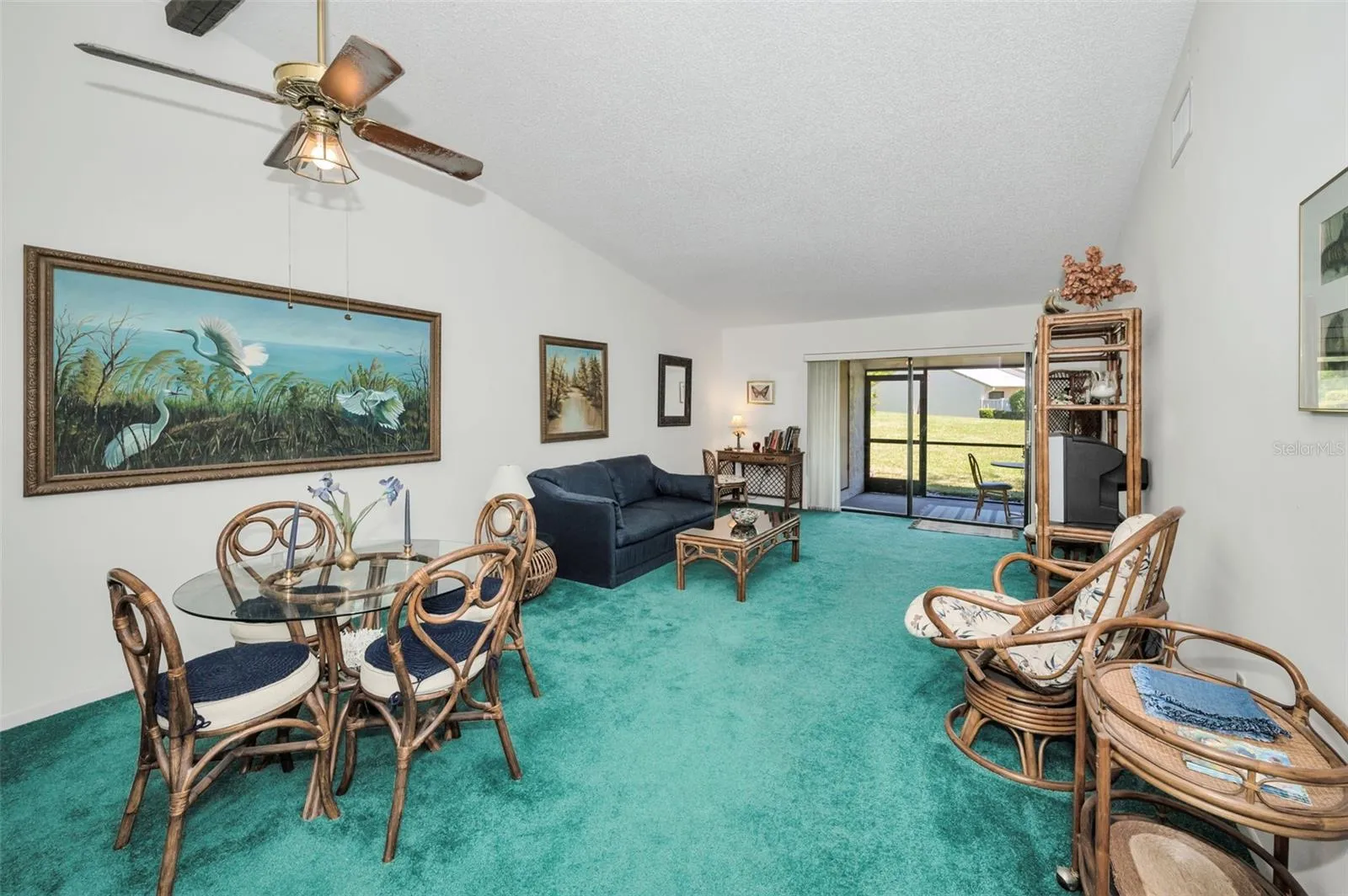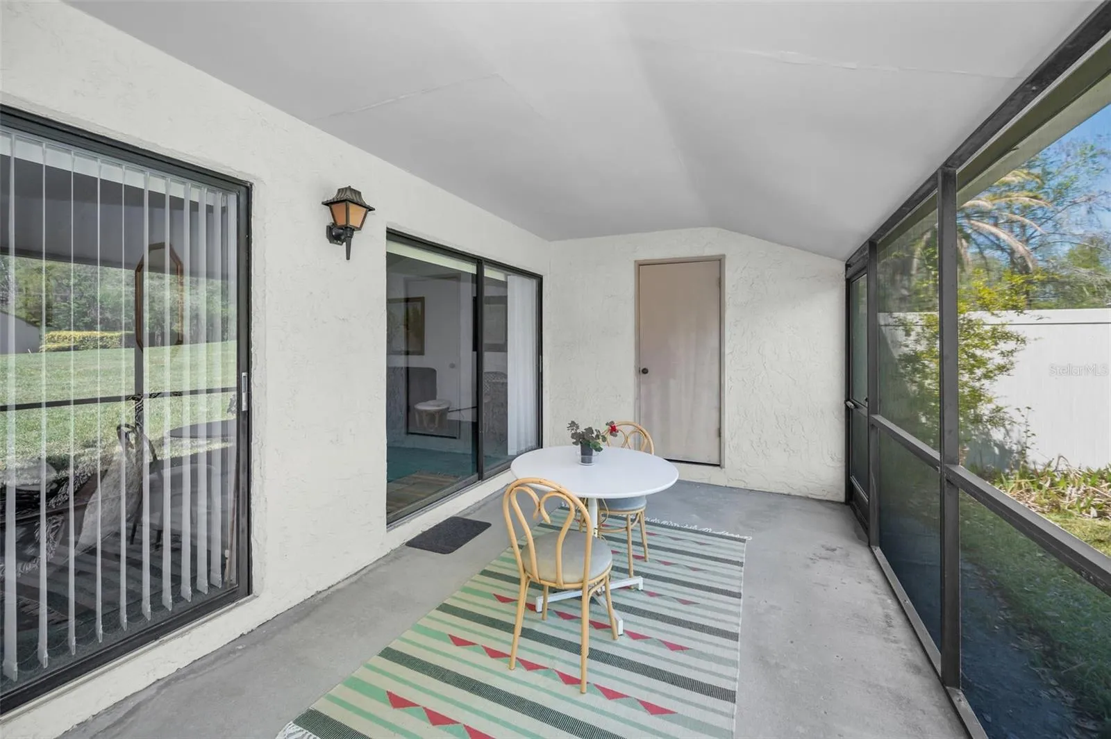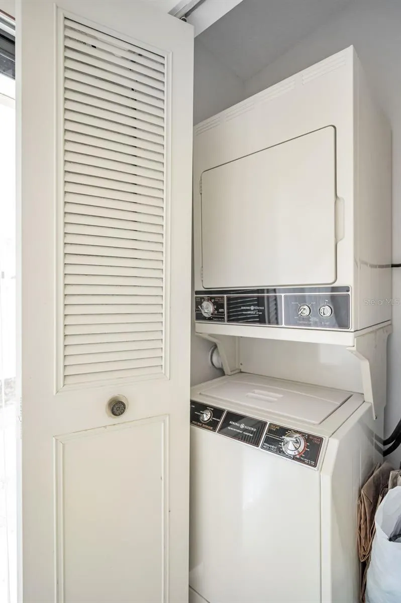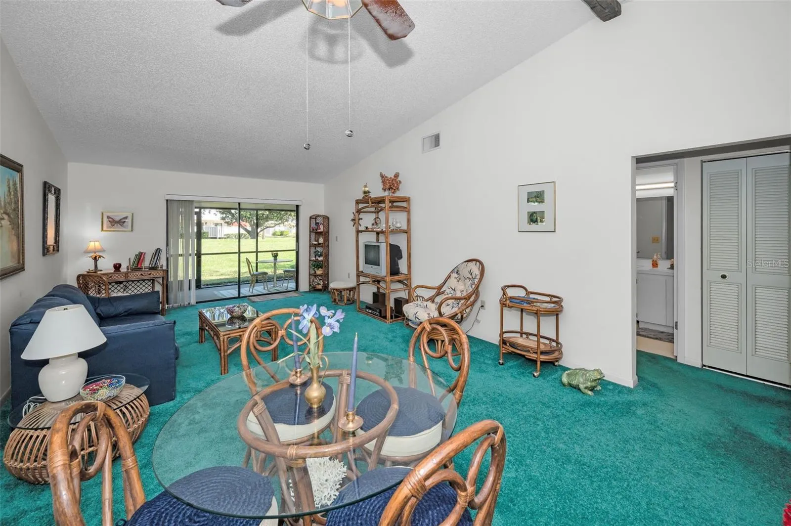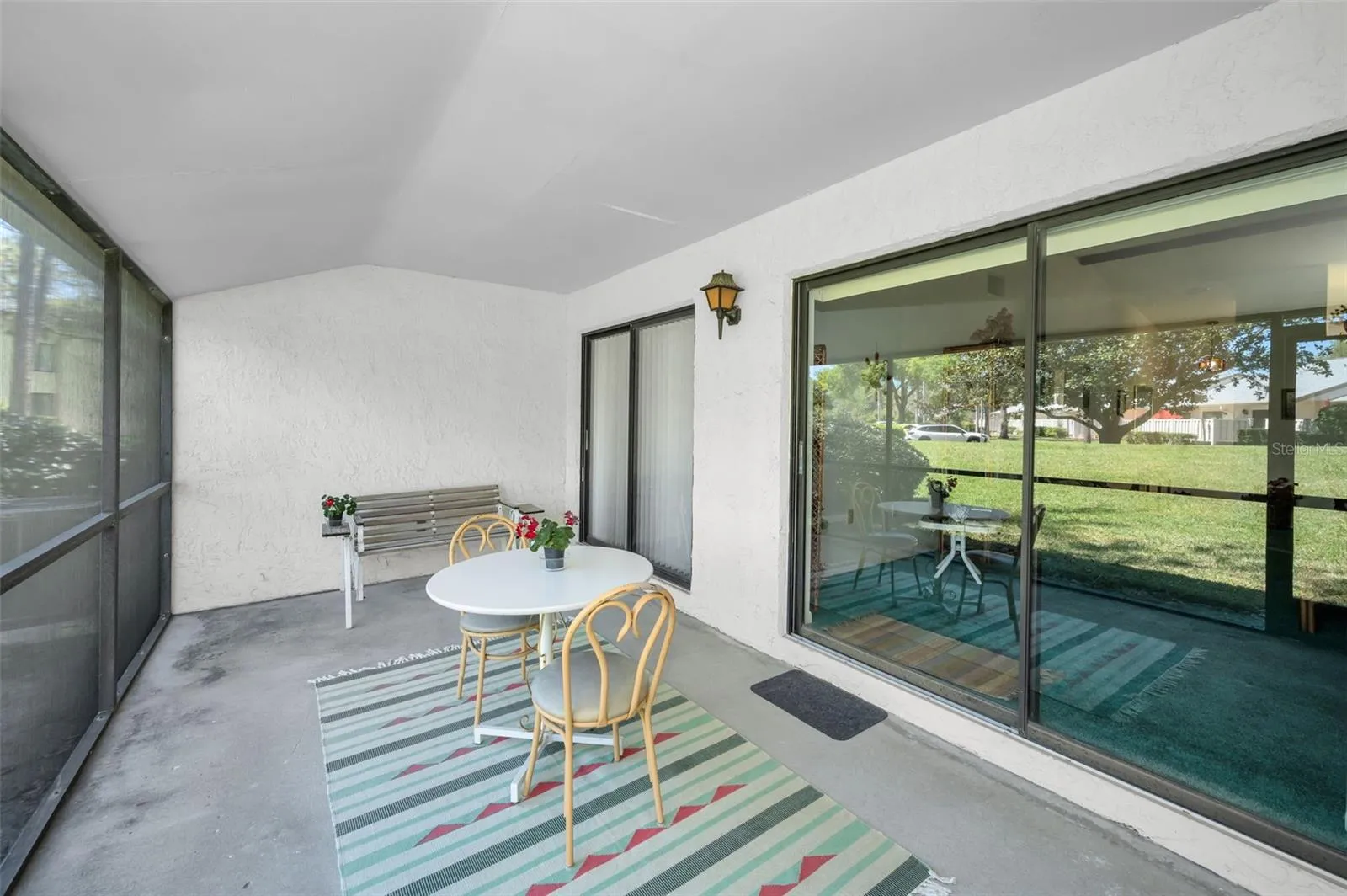 Inside, the home features 2 bedrooms and 2 bathrooms with an open floor plan that fills the space with natural light. Vaulted ceilings add an extra sense of spaciousness, while the kitchen is bright and inviting, complete with an eat-in area, closet laundry, and a new refrigerator (2024). The HVAC system was replaced in June 2022. Just beyond the kitchen, the dining and living room combo opens to a screened lanai with brand-new screens (March 2025) and a generous storage closet. This area can also be enclosed for additional living space if desired.