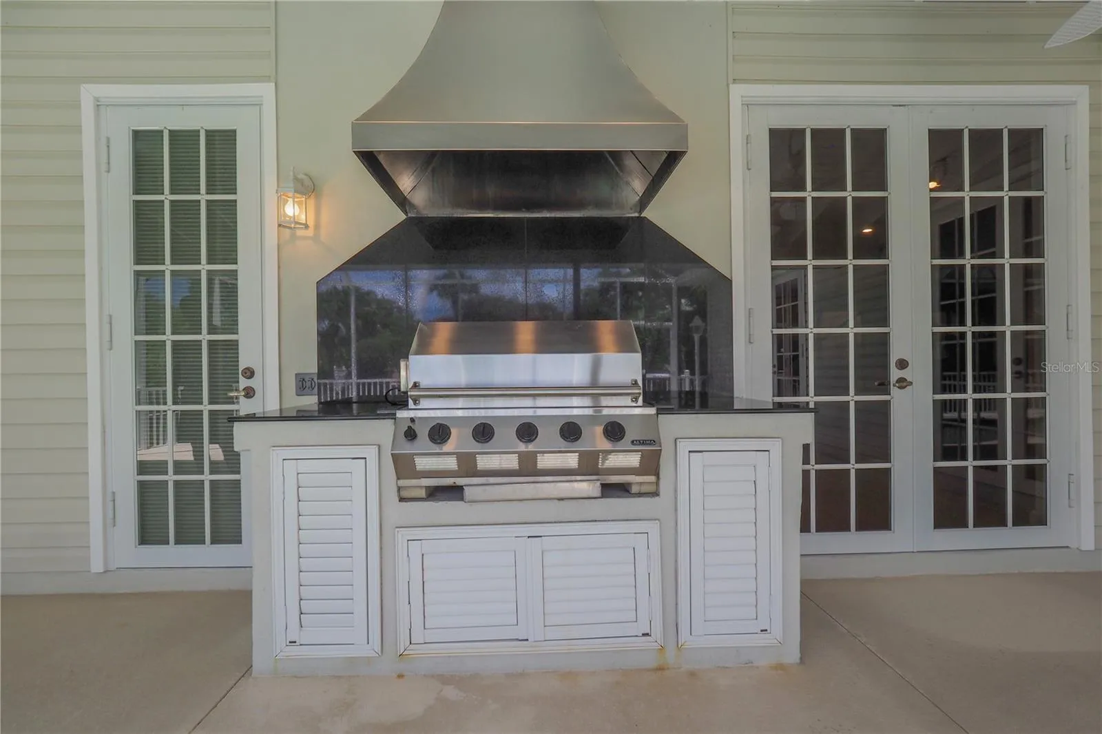 Screened pool area with large covered porch (9’ x 32’), Altima natural gas grill, and stainless-steel exhaust hood.