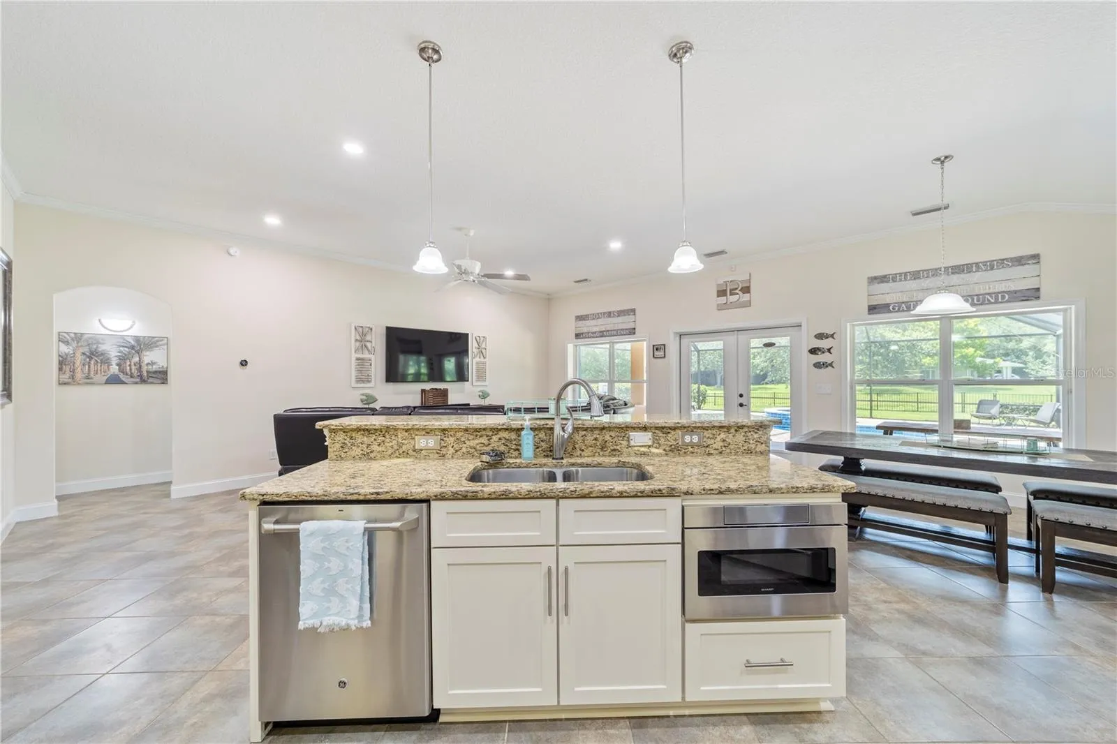 Welcome to your dream POOL home in the highly sought-after Royal Pines subdivision of World Golf Village, St. Augustine! Built in 2016 by Magnolia Homes, this beautifully maintained 3-bedroom, 3-bath residence with flex room offers the perfect blend of elegance, comfort, and functionality — all tucked into a meticulously kept neighborhood known for its upscale homes and A-rated schools. From the moment you arrive, you’ll be drawn in by the home’s impressive curb appeal, enhanced by elegant pavers and a spacious 3-car garage with epoxy flooring. Step inside and be greeted by 10′ tall ceilings, crown molding throughout, and warm tile floors that flow seamlessly through the main living areas (carpet only in bedrooms for comfort). A large flex room with French doors sits just off the entry — ideal as a home office, den, playroom, or game room. The possibilities are endless. The gourmet kitchen is a chef’s delight featuring granite countertops, GE Profile stainless appliances, a gas range, beverage/wine cooler, separate ice maker, stainless hood, and soft-close cabinetry. A walk-in pantry and an additional appliance/overflow pantry provide ample storage for all your culinary needs.