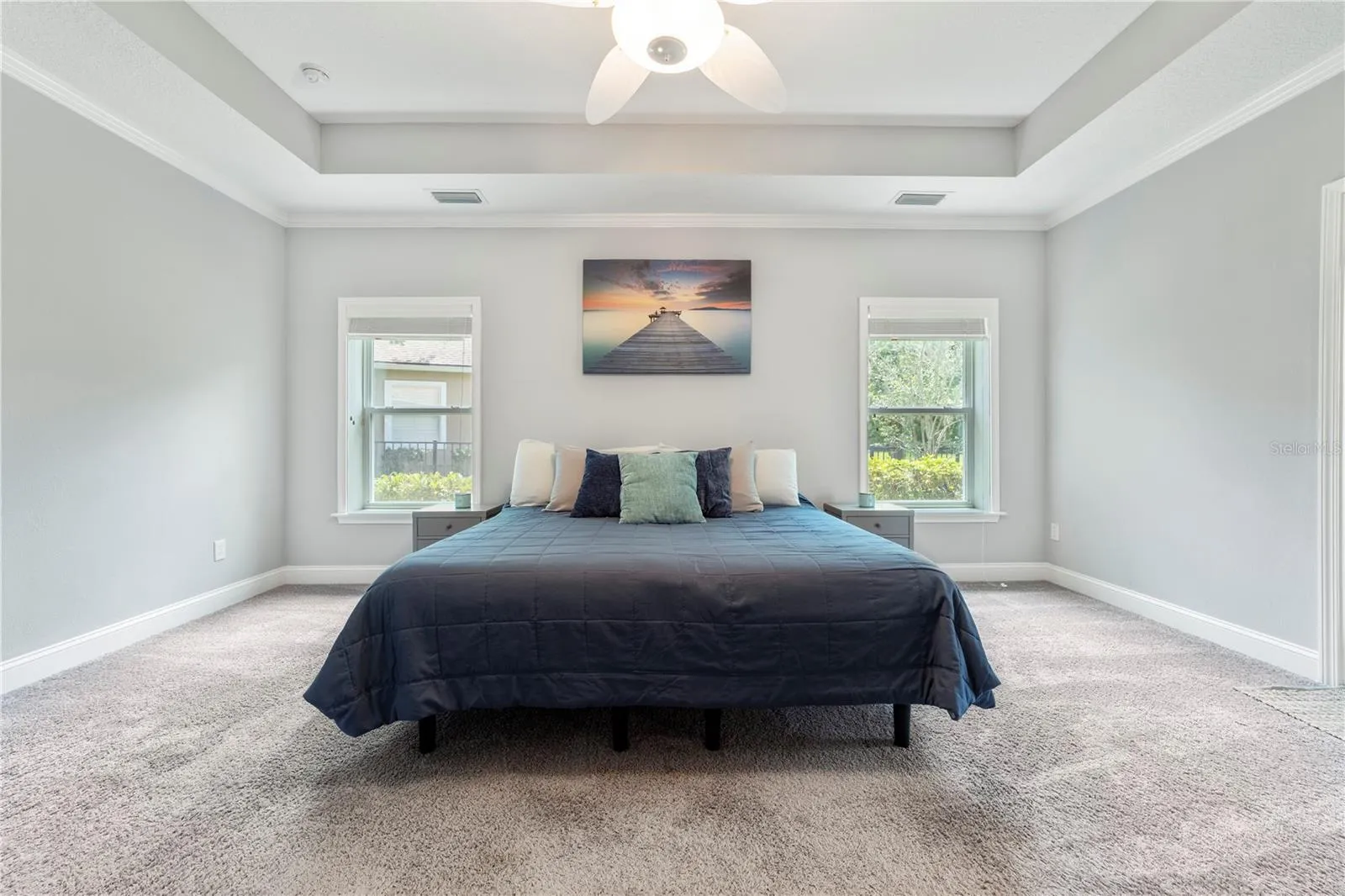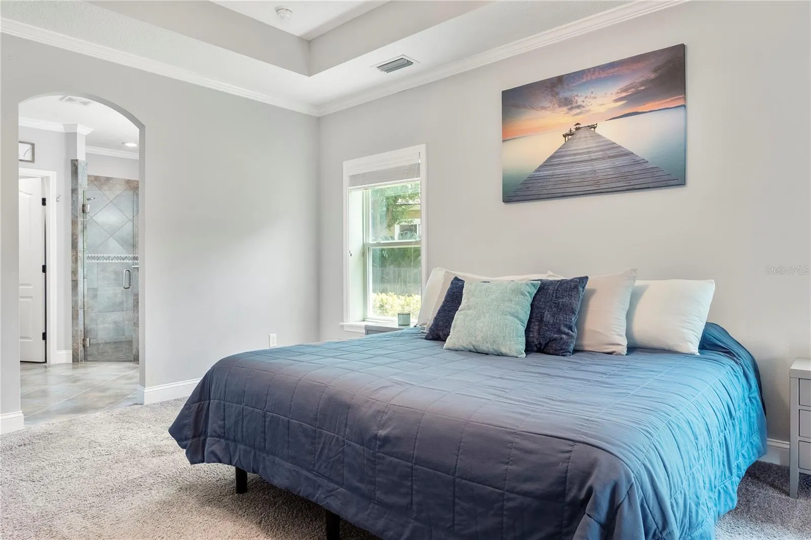 Retreat to the primary suite, where a tray ceiling adds a touch of luxury and French door leads directly to your private pool oasis. The screened lanai offers a covered outdoor living area perfect for entertaining or relaxing beside the sparkling pool and spa. Enjoy peaceful mornings and stunning sunsets with tranquil views of the beautiful pond just beyond your wrought iron fence – a true backyard retreat. Recent updates include pool regrouting (2024) and a newer pool pump (2023), while modern conveniences such as a Nest thermostat, keyless front door entry, and Gulf Coast fans throughout add style and ease.