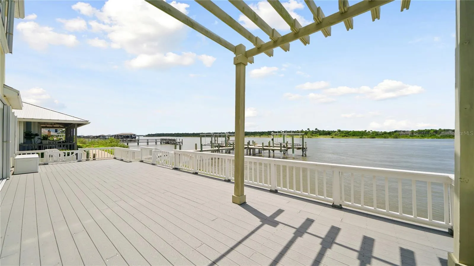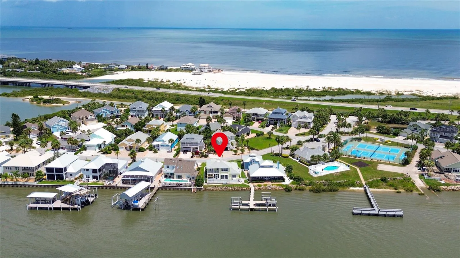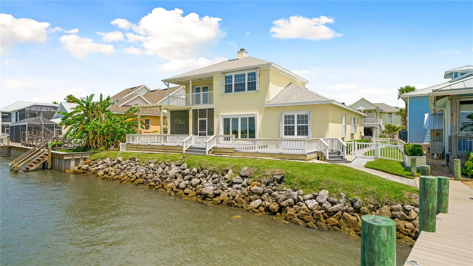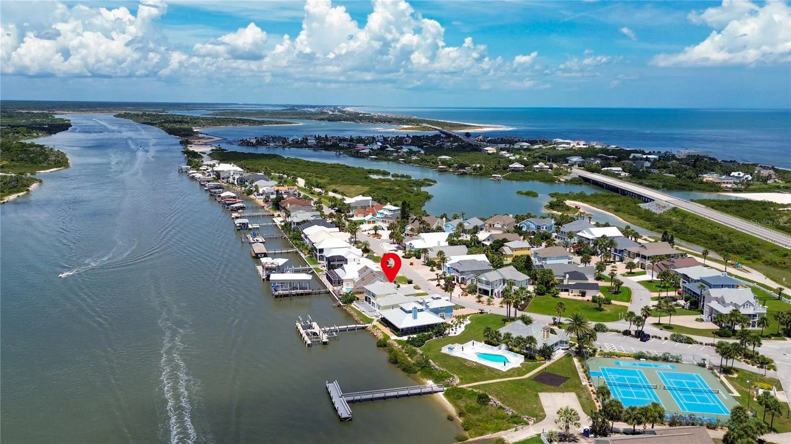 Welcome to 9179 June Lane, a direct Intracoastal front retreat in the private, gated community of Summer Island in St. Augustine. This high-and-dry home has never flooded, offering peace of mind along with breathtaking west-facing views—perfect for enjoying unforgettable sunsets over the Matanzas River. Across the water lies a protected preserve that will never be built on, ensuring your views remain pristine. With 70 feet of waterfront, a boat lift, dipped pilings for durability, and a dock crafted from top-grade marine materials including composite decking, you’ll enjoy a low-maintenance, long-lasting setup ready for boating at any tide. Inside, the home offers a thoughtful 3-bedroom layout, highlighted by two primary suites. The main-level primary suite provides convenience and accessibility, while the second-floor primary suite features its own private balcony overlooking the Intracoastal—an ideal retreat for sunset views. The third bedroom is generously sized, perfect for family, guests, or a home office. Elegant details such as crown molding pair with modern updates throughout, including a fully renovated kitchen, bathrooms, and flooring. For added security and efficiency, the home is equipped with hurricane-rated windows, sliders, and storm shutters, and all major systems have been updated including a 2015 roof and water heater, 2021 HVAC, and complete re-plumbing. The exterior is equally impressive, with professional landscaping, a paver driveway and walkways, a composite back deck, freshly painted exterior, and a fully equipped outdoor kitchen with plumbing—perfect for entertaining with a view. Best of all, the beach is just across the street, making this a rare opportunity to enjoy both riverfront living and ocean access within a gated community that also offers resort-style amenities including a clubhouse, pool, tennis and basketball courts, a community dock with boat launch, and underground utilities.