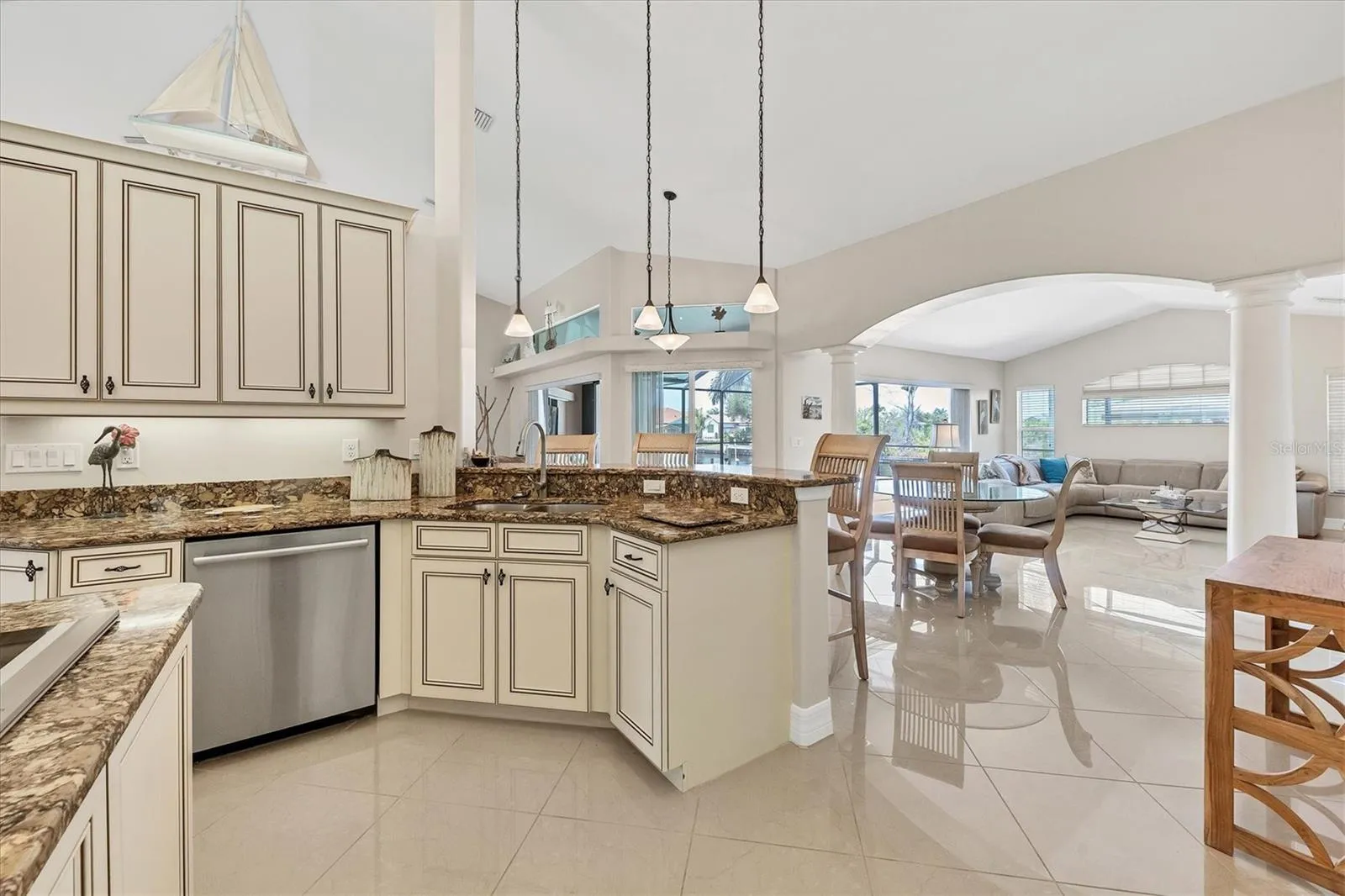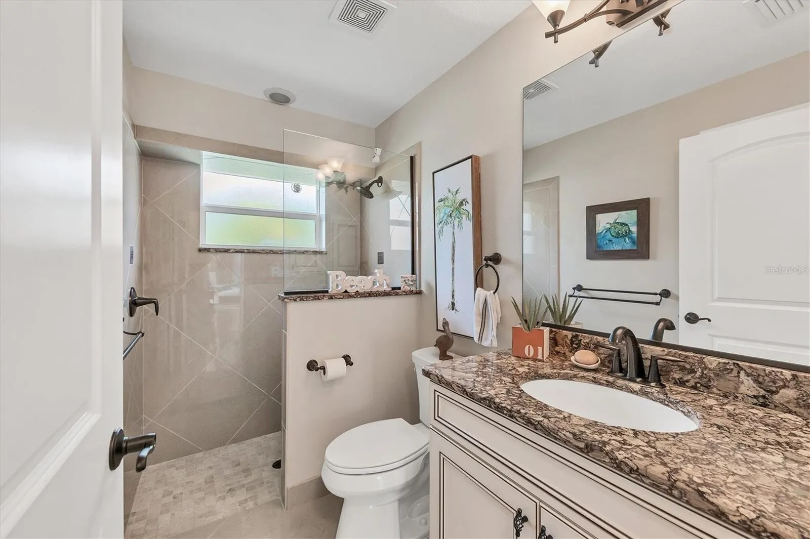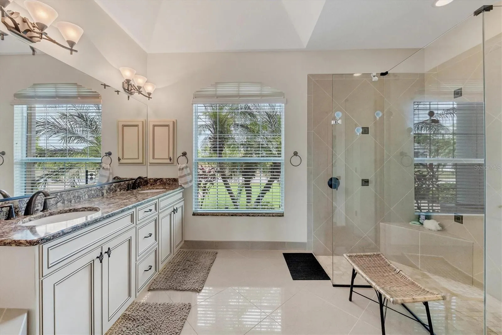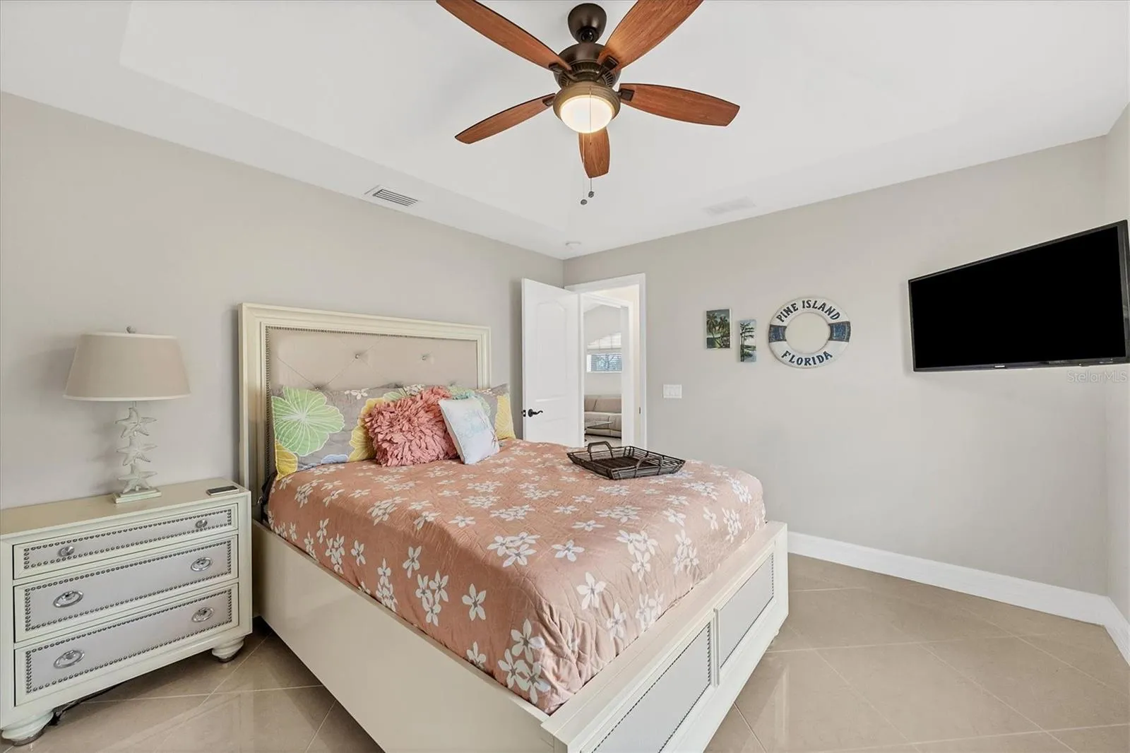 The popular Florida split floor plan provides maximum privacy, with the oversized primary suite tucked away from the guest bedrooms. The primary bedroom boasts a tray ceiling, a walk-in and reach-in closet, and sliding doors to the lanai. The en-suite bath features dual granite vanities, a private water closet, a glass-enclosed walk-in shower, and a luxurious soaking tub — perfect for unwinding after a day on the water.