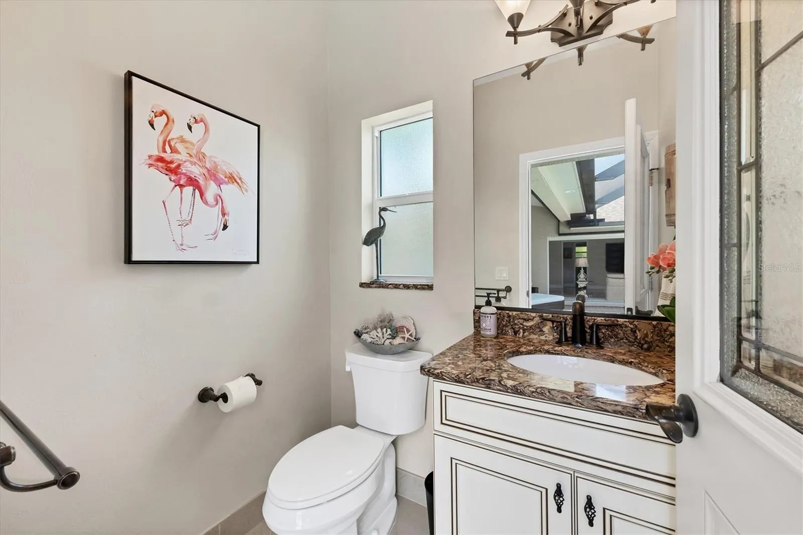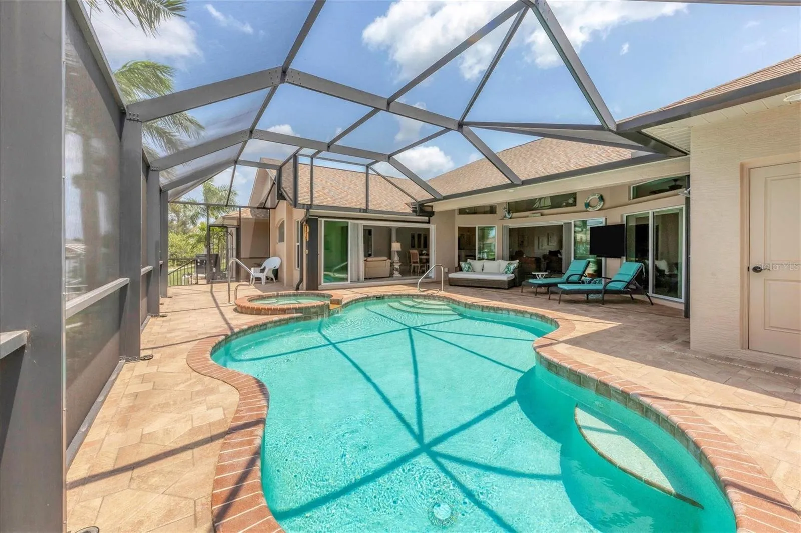 Step outside to your private resort-style lanai, featuring a saltwater heated pool and attached hot tub with upgraded Wi-Fi controls for ultimate comfort. Lounge under the covered area and catch your favorite show, or rinse off in the outdoor shower after a day in the sun. A separate pool bath and storage room complete this exceptional outdoor living space.