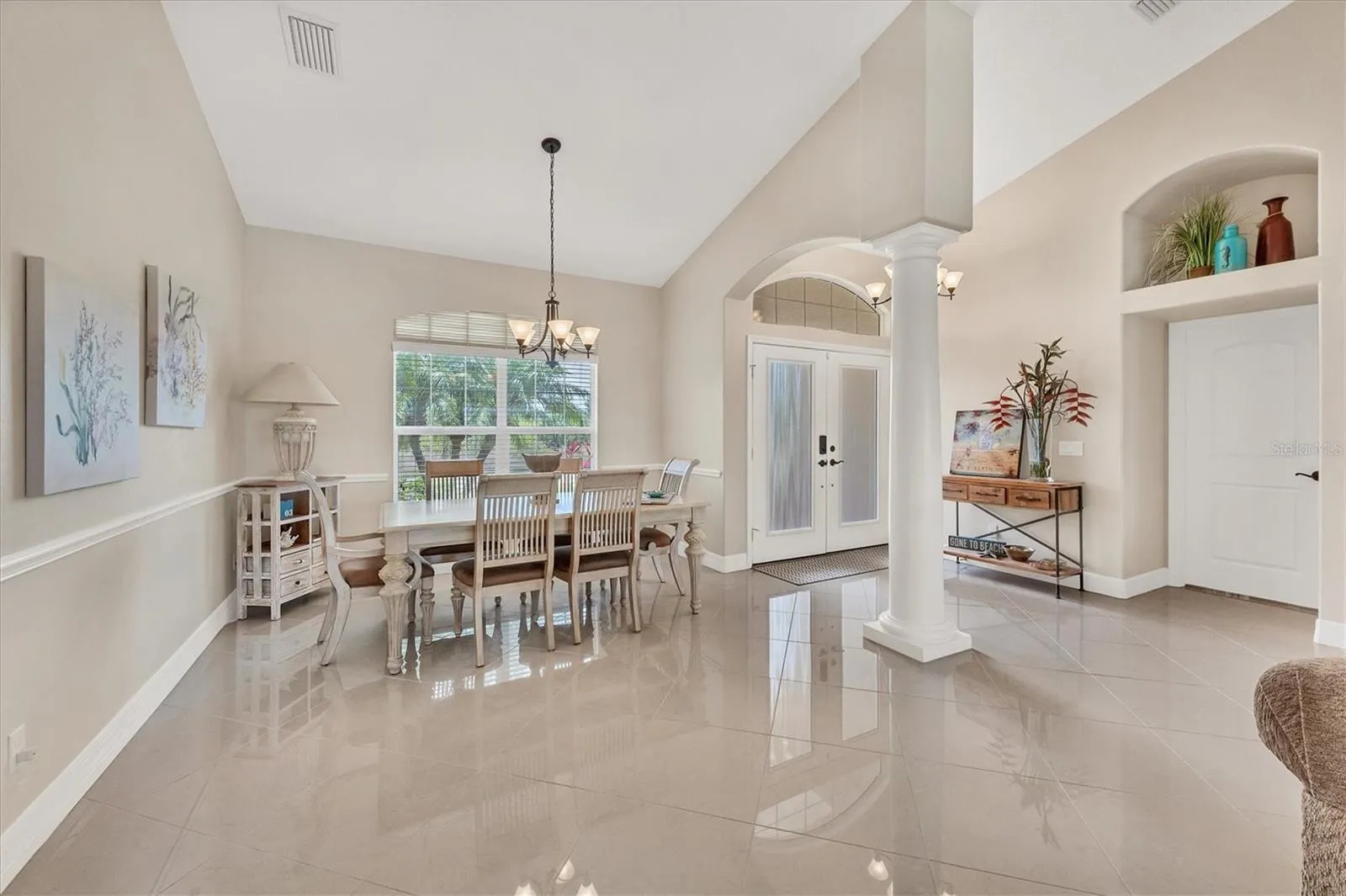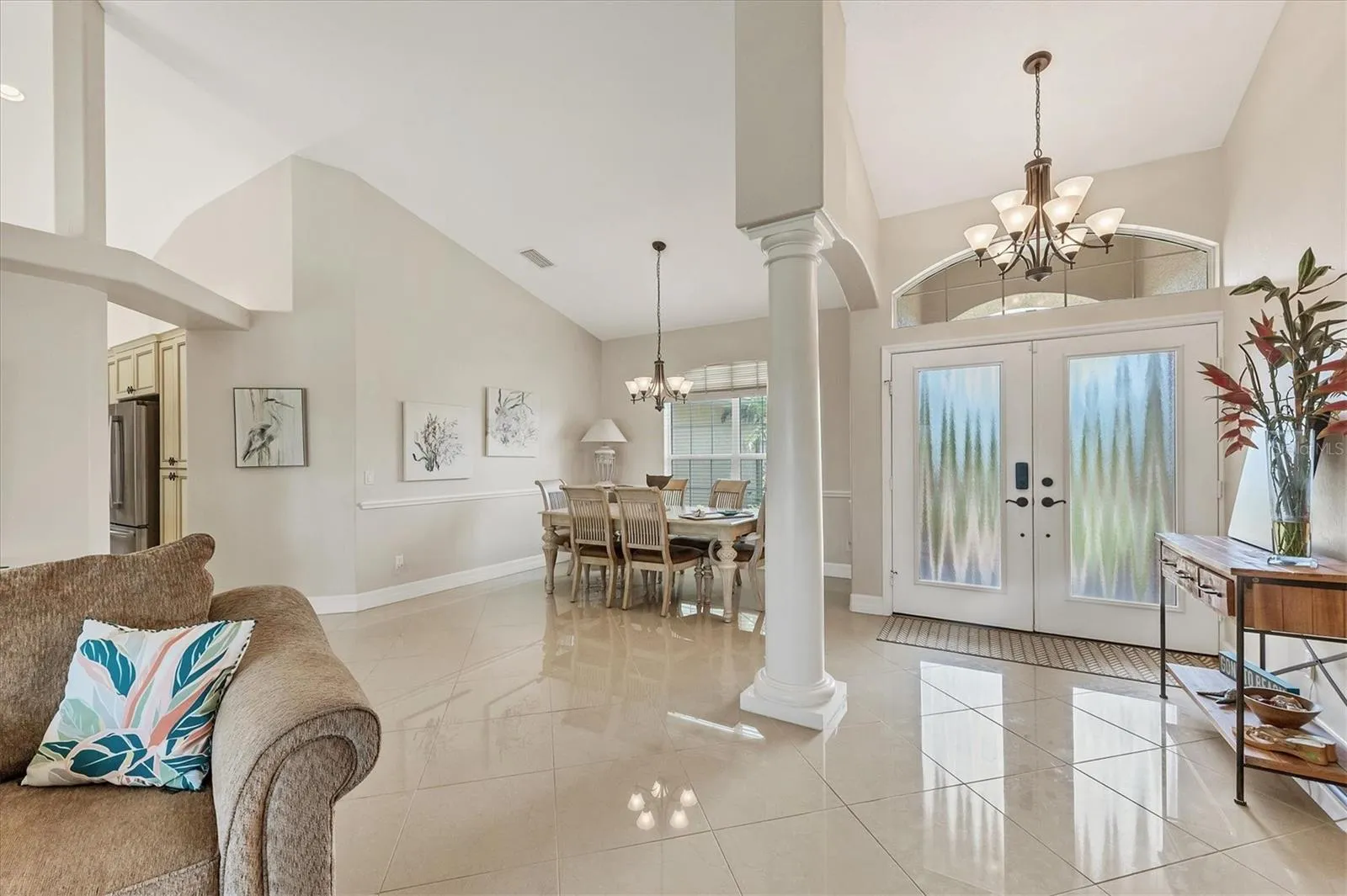 As you arrive, you’ll be immediately impressed by the beautifully manicured landscaping, stamped concrete driveway and walkway, and the elegant curb appeal. Step through the double entry doors and be greeted by an abundance of natural light that pours into the open-concept living space, highlighting the gleaming polished tile floors and sophisticated architectural details throughout.