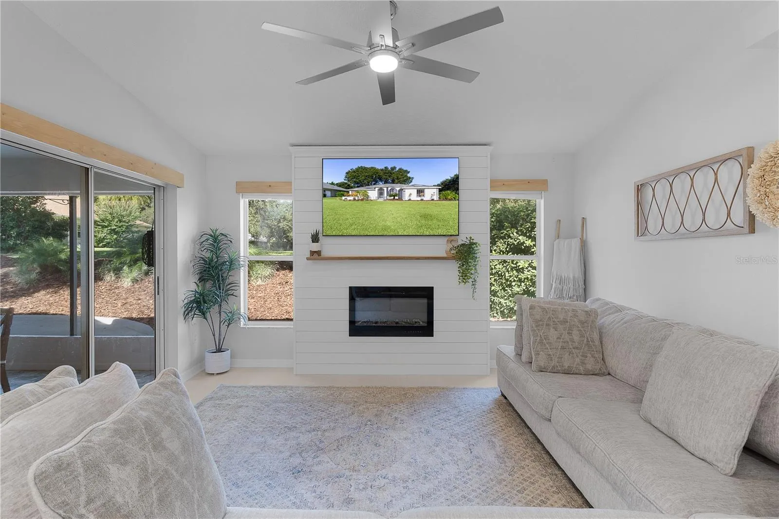 Welcome to The Grove! An HOA Community with fees of only $77/month! This home is move-in ready with too many improvements to list, including a WHOLE HOME water filtration system and a Stanley Steamer Restore UV light system to keep the air ducts clean and healthy from the Florida humidity! There is also a transferable home warranty, which includes the A/C & hot water system! This home has the light, bright look you’ve been looking for with light-colored granite and quartz counters, open floor plan and one continuous flooring throughout the home. The spectacular feature wall with shiplap and an electric fireplace is a great area to get cozy and feel the ambiance created! A spacious Primary bedroom is located on the opposite side of the home from bedrooms 2 & 3 for the utmost privacy. Other aspects of this home to consider are the oversized screen lanai, a side garage (new garage door and system!) with more driveway space that is so convenient! Residents may choose to become social members at the clubhouse for an additional fee. Please call the clubhouse for information on how you can enjoy features such as pickleball, tennis, indoor racquetball, sauna and weight room. The breathtaking views overlooking Lake Griffin from the gorgeous pool might alone just be with the membership! If you would rather be on the lake than observing the view, there is also an opportunity to use the marina! The clubhouse restaurant is just perfect for your needs after golfing, swimming or boating. Roof is 2020. NO BOND, FURNITURE AVAILABLE SEPARATELY!