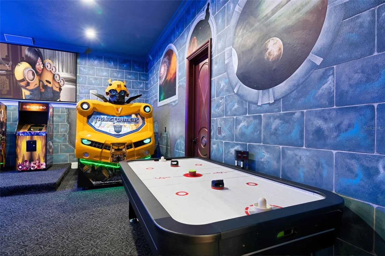 Entertainment abounds throughout the home. The private movie theater offers plush seating and a cinematic experience perfect for family nights, while the garage has been professionally converted into an innovative arcade room, complete with a treehouse-inspired slide, air hockey table, skee-ball, and multiple console games guarantees endless fun for guests of all ages. The sleek open-concept living areas flow seamlessly, creating warm and inviting spaces ideal for hosting and sharing special moments.