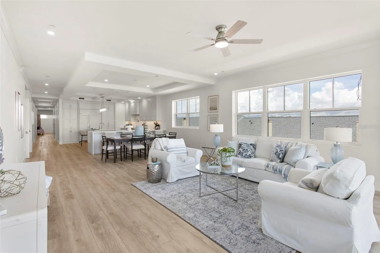 The open-concept great room flows effortlessly between the dining space and living area, complete with motorized window treatments and access to a deep covered waterfront balcony—a perfect spot to unwind while taking in tranquil views of the pool and Intracoastal.
