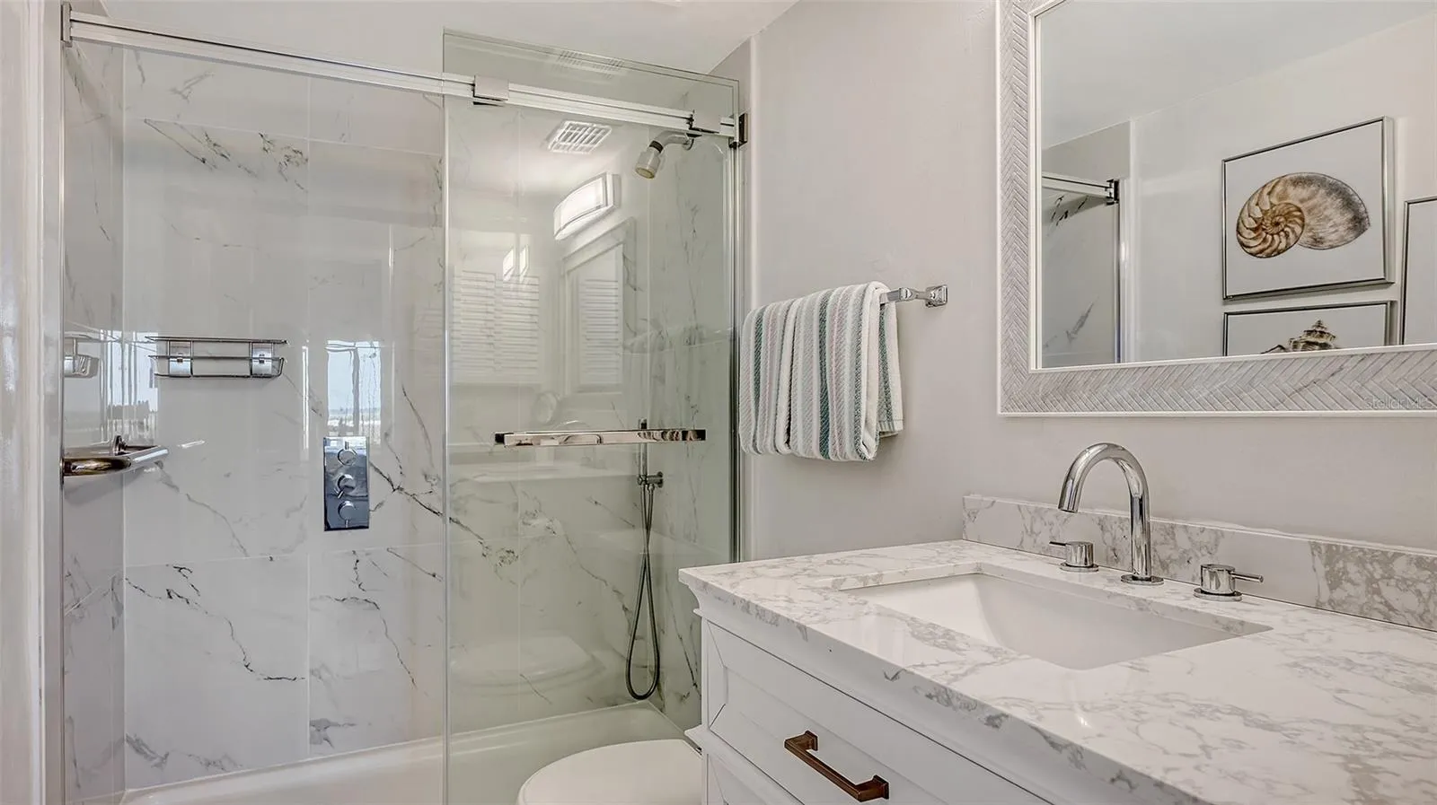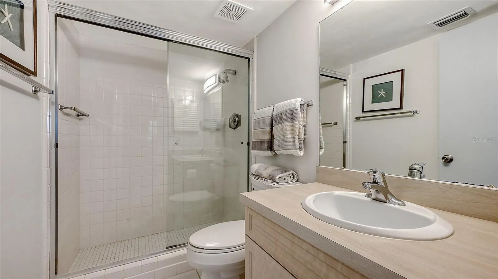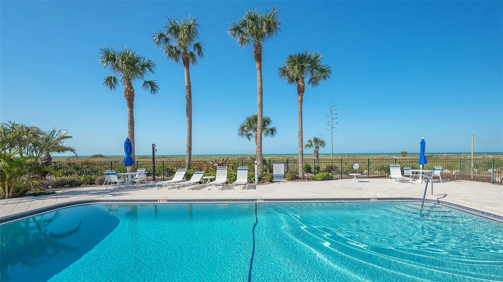 WOW! The minute you open the front door of this first floor Coastal Retreat Seaside condo, you will be captivated by the shimmering, turquoise Gulf of Mexico Water View and the Panoramic Sandy White Beach in front of you. You’ll be eager to get a closer look from the glassed in Florida Room, so you may overlook the beauty of this updated, attractively furnished & decorated first floor residence at Sea Pines, a small 28 unit beach front condo complex on the north end of Longboat Key, Florida. Since purchasing five years ago, these owners have lovingly transformed this almost 1400 square foot, corner unit with extra windows, open concept, two bedroom with En Suite baths & walk in closets to today’s coastal contemporary style tastes. Improvements include light oak color Luxury Vinyl wide plank flooring throughout, Samsung stainless steel appliances including washer & dryer, new HVAC installed, updated the primary bedroom with a quartz counter vanity, tiled & glass door shower, and fitted out closet. The condo’s interior was painted as well & new, high quality neutral colored living room, dining & bedroom furniture, rugs, lighting & drapery, artwork and a large entertainment center installed. A new tiled roof was installed on this building in 2024. Additional features include impact resistant windows in both bedrooms & the office adjacent to the
