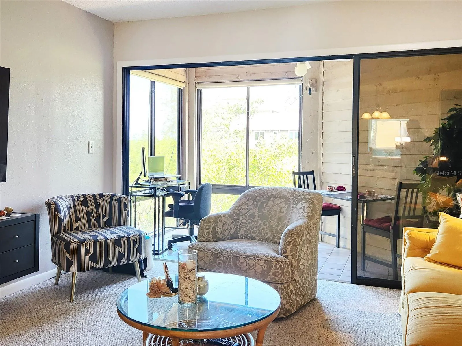 Step inside to find a sunlit open-concept living and dining space that flows effortlessly onto your private balcony or patio—ideal for morning coffee or sunset cocktails with views of swaying palm trees, coastal mangroves, and the sparkling Gulf beyond. Natural light pours through large windows, highlighting the home’s clean, modern finishes and tranquil vibe.