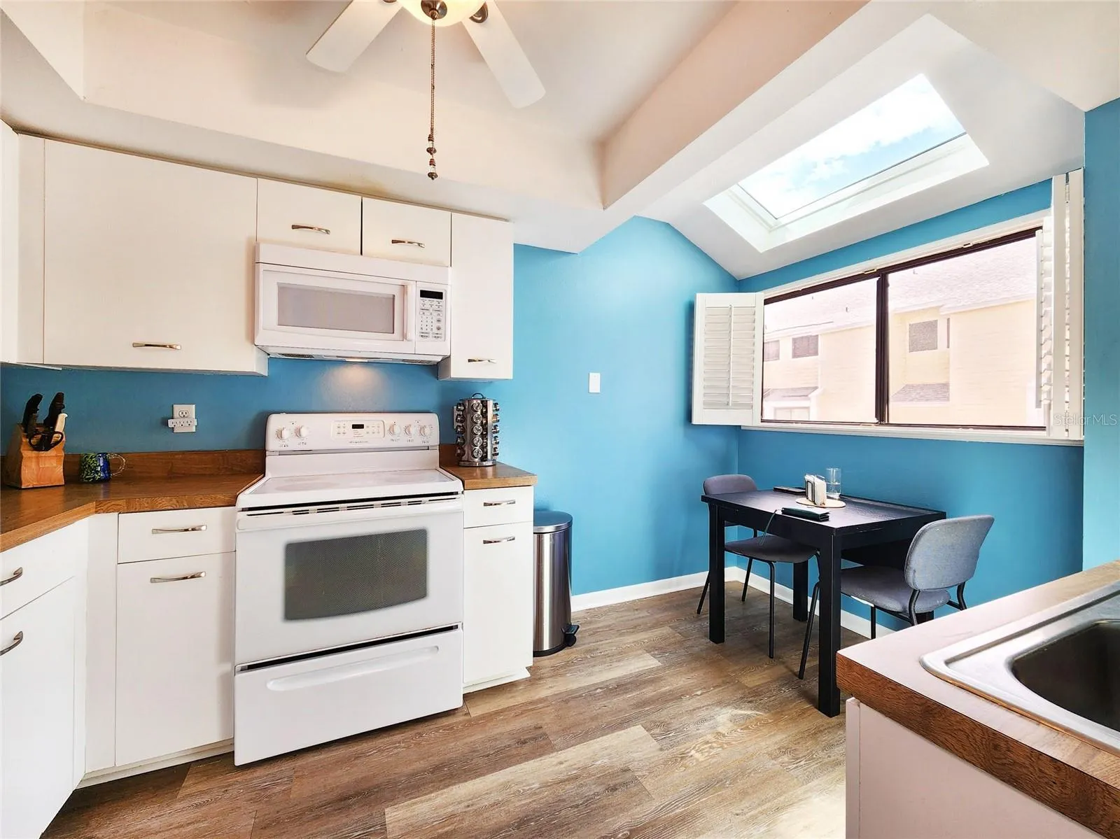The kitchen is both stylish and functional, with generous cabinetry, a breakfast bar, and a skylight that brings in even more sunshine—perfect for everything from quiet mornings to entertaining guests.