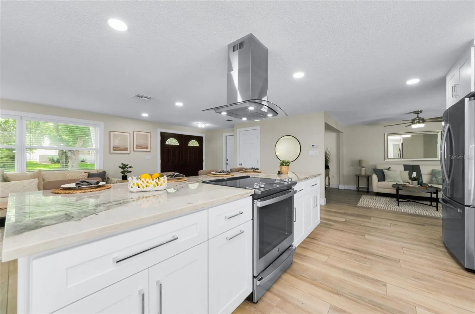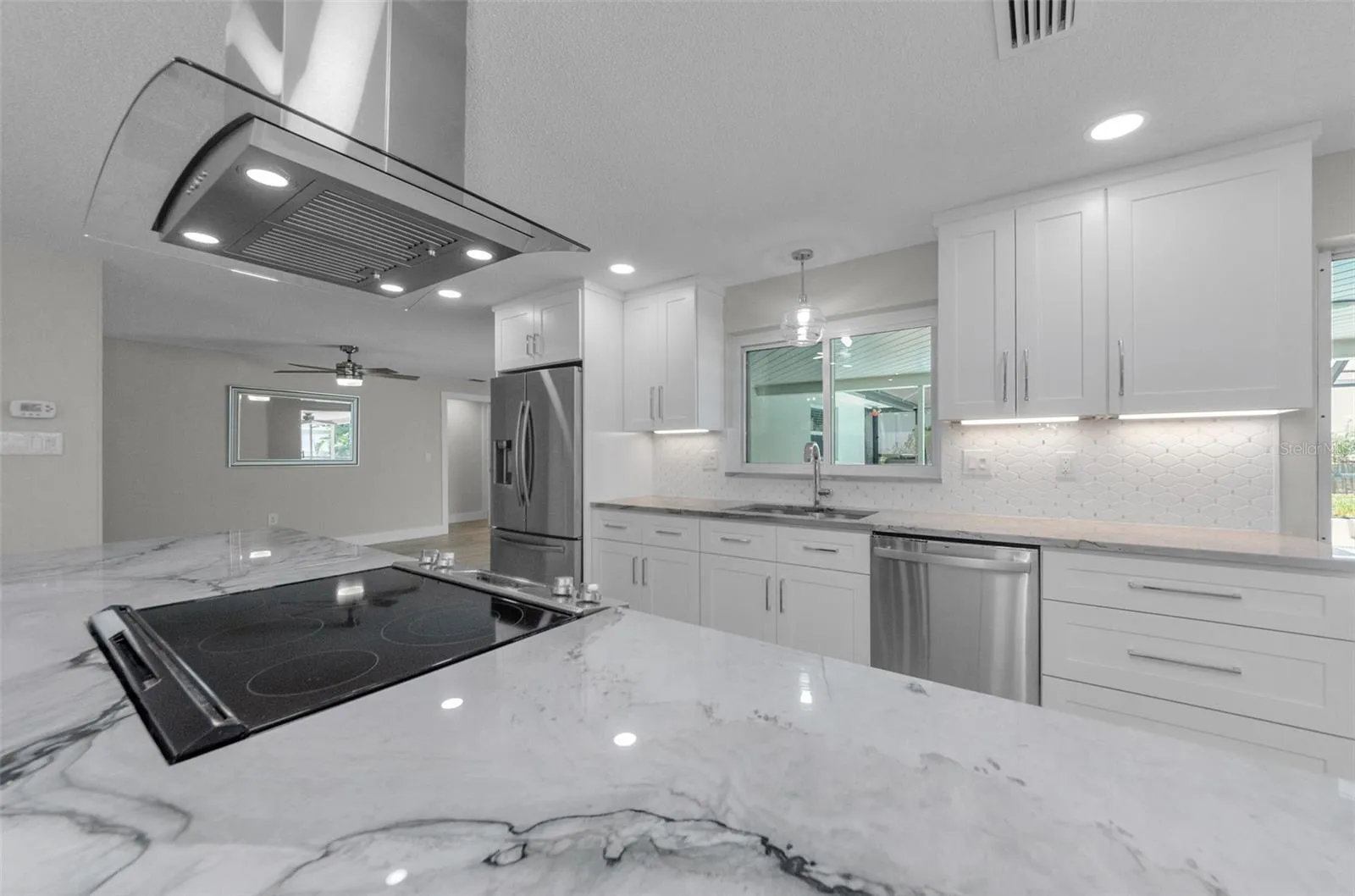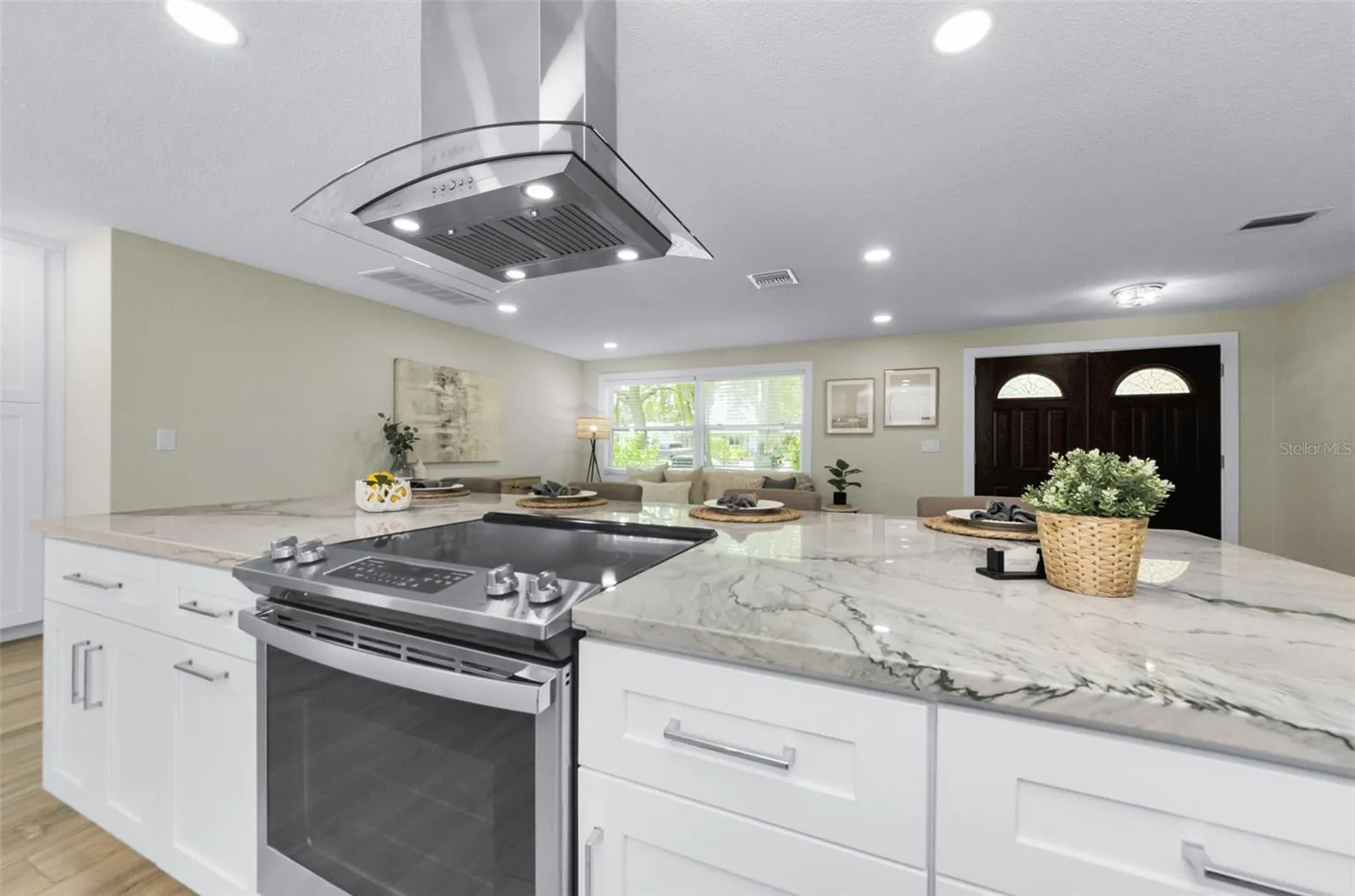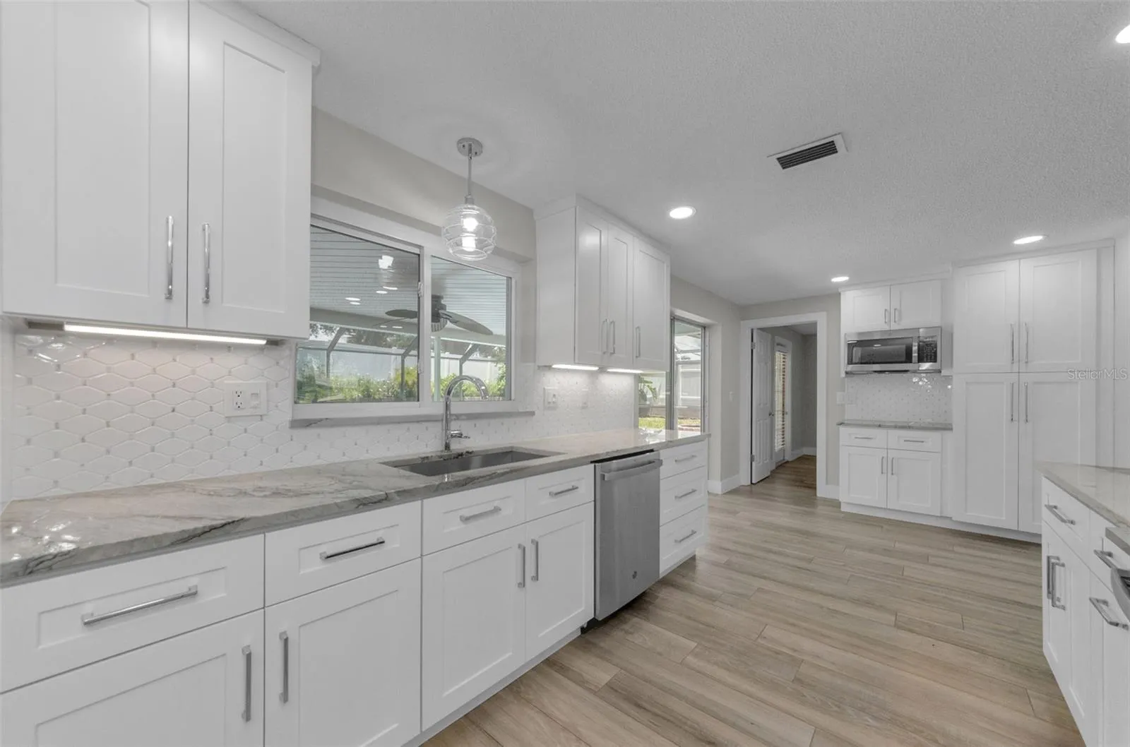 Step inside, and you’ll immediately be impressed by the bright, open layout. The kitchen is a true highlight, featuring sleek white cabinetry, stunning Quartzite countertops with a 10 x 4 island and top-of-the-line stainless steel appliances. The coffee bar is an unexpected touch. Whether you’re preparing a family meal or hosting guests, this kitchen offers both style and functionality. The adjoining living and dining areas are perfect for gathering, with plenty of natural light streaming in through large windows.