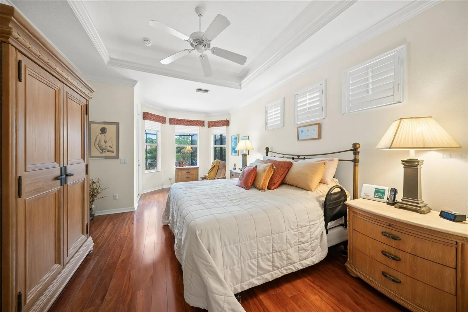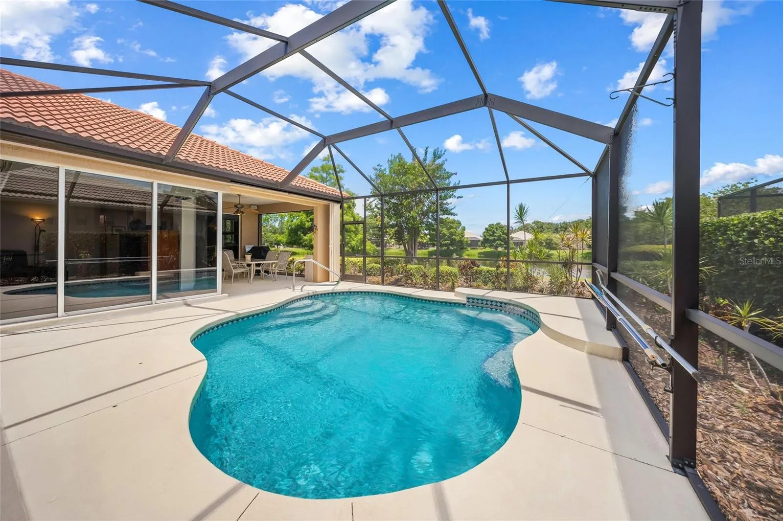 In the Lee Wetherington-built community of Willowbend is a stunning home. This enchanting residence borders a sparkling lake with curb appeal emphasized by lush landscaping and a paver-accented driveway. This quality-built home is the desirable Ashley II floor plan, with an oversized 23-by-19-foot garage. Every detail in this home is addressed with remarkable style including double-door entry, vaulted tray ceilings, crown molding, plantation shutters and many built-in features. The kitchen is spacious in design with wood cabinetry, a center island, kitchen desk and granite counters. The kitchen dining area has wide open views through an aquarium window. Formal dining room has a granite-topped built-in buffet, framed by an arched wall. The family room has a double tray ceiling with corner pocket sliding doors. Owner’s suite features wood flooring, walk-in closets and a luxurious bath with dual sinks, a garden tub, a walk-in shower plus direct pool and lanai access. Three bedrooms on the opposite side boast large closets, two with private pocket door access and bath, the fourth bedroom also has a bath serving as a pool bath. Two of the bedrooms have extensive built-in shelving and desks. It’s always about the view and you will enjoy the privacy of a large lanai with a heated pool. Nothing captures the mood better than serene living with a menagerie of birds and wildlife. On a practical side, home has hurricane protection, and air conditioner replaced in 2018. Near top-rated Pine View School, Legacy Trail, restaurants, beaches, Intracoastal Waterway, boat and kayak launches, Publix, plus coffee shop, gym, Pilates and more. For those who seek an exceptional waterfront lifestyle, nothing compares. Low HOA fees include maintenance of yard, irrigation water, community pool/spa, high speed internet, cable TV, gym and pickleball court. While a short distance from the Intracoastal and Gulf of Mexico, this home is in a preferred X flood zone.