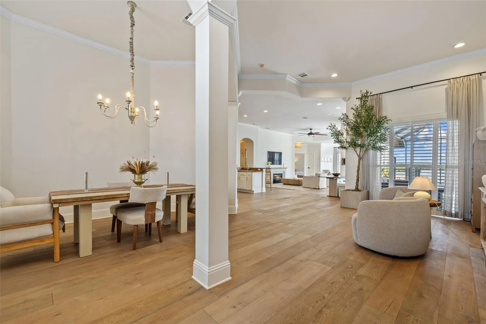Step inside and take in the sweeping water views from the formal living and dining rooms, family room, and private owner’s suite. High ceilings, hardwood floors, crown molding, plantation shutters, and designer lighting create a timeless ambiance, while the split-bedroom layout offers comfort and privacy throughout.