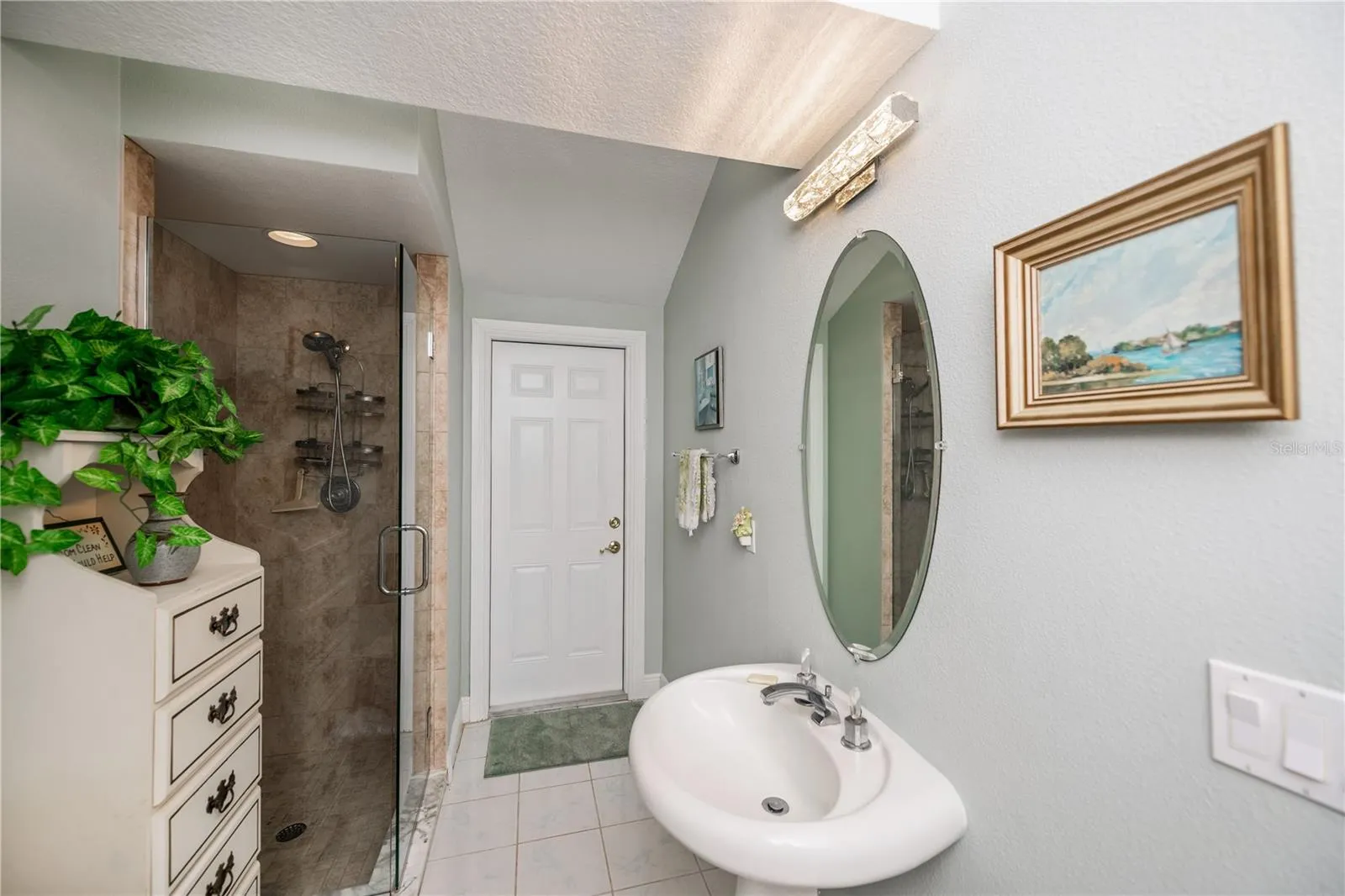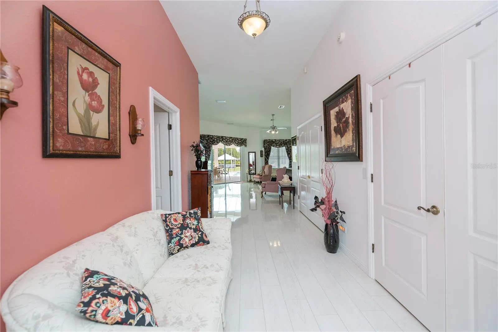A genuine in-law suite complete with a connected bath and private screened-in patio offers lovely pond views. Additionally, a large laundry room, with substantial storage, a wash sink, and built-in ironing board, provides easy access to the expansive 3-car garage large enough for large SUVs and includes automated screen doors to keep insects at bay.