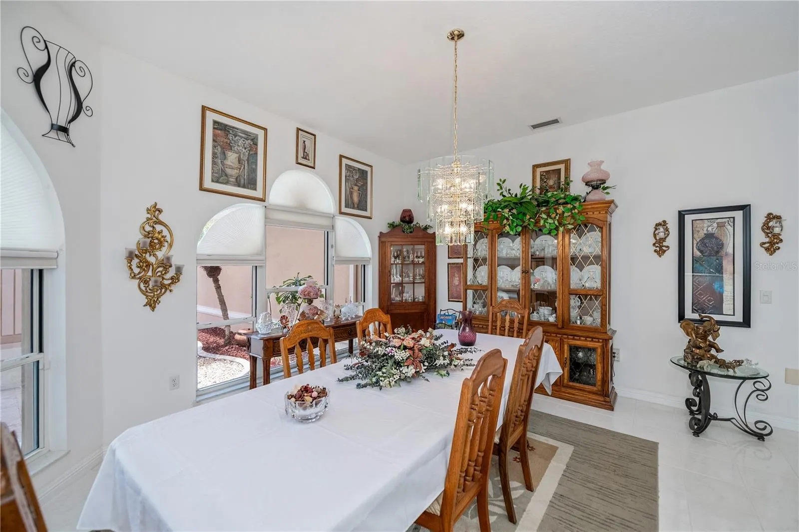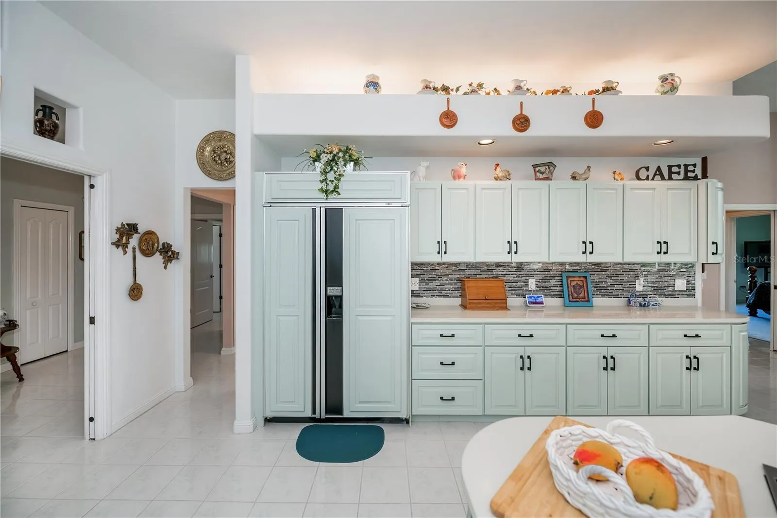 An exquisite dining area beckons you into the heart of the home: a well-appointed kitchen that embodies luxury with top-of-the-line appliances, a Sub-Zero refrigerator, double oven, and vented cooktop in the kitchen island, the modern, seagrass-hued Corian countertops and two-tone cabinetry exude sophistication. There is also a breakfast bar, full-sized dining area, and generous walk-in pantry.