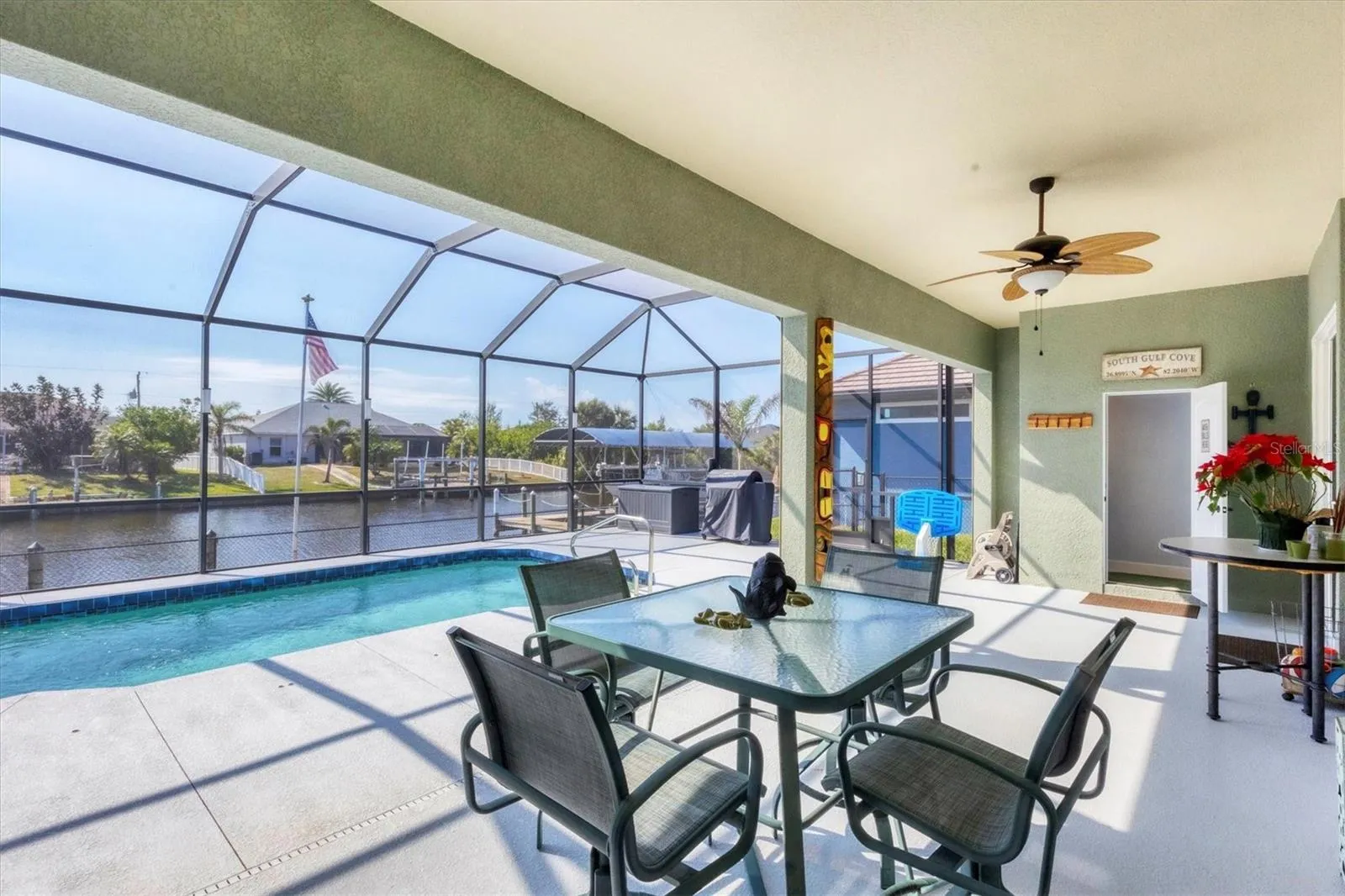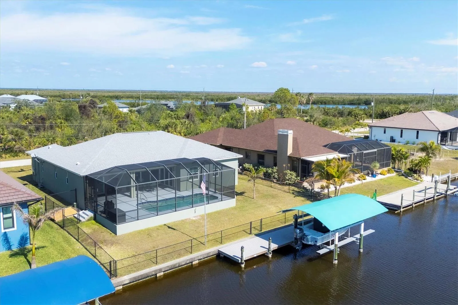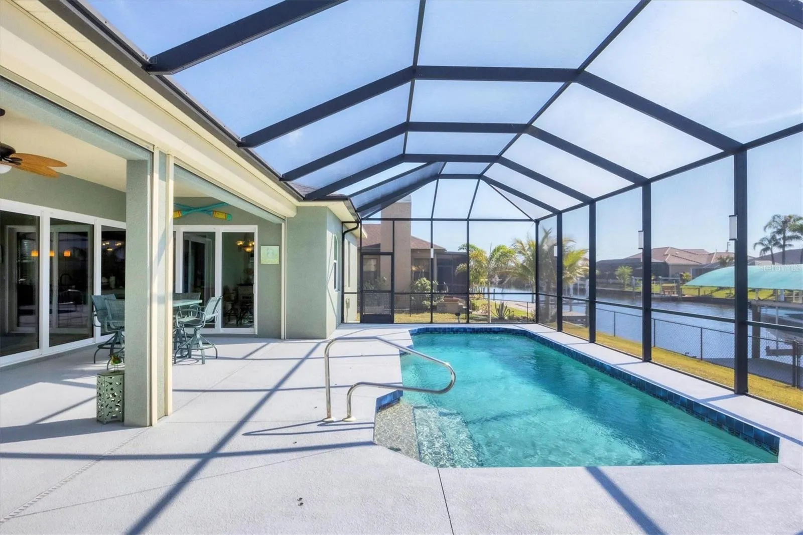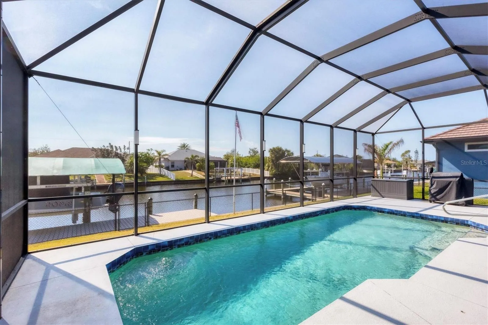 Location, location! South Gulf Cove welcomes you to the Florida lifestyle, in one of the most desirable areas of Port Charlotte. As you enter your view of the lanai and waterway is wide open through zero corner sliders that line the main living area. These literally bring the outdoors in and double your living space. The living room/great room is spacious with a beautiful coffered tray ceiling, and adjoining dining room will compliment your special gatherings. These flow to the open kitchen featuring an oversized granite breakfast bar with plenty of room for preparing and serving. Crowned wood cabinets, stainless appliances, walk in pantry and an cooktop make your life easy. Serve your feast in the large dinette area, which is also open to the beautiful views outdoors. The master suite is lovely with two HUGE closets, and the ensuite features a walk through shower with two rainheads. The guest bedrooms in this split plan can be closed off for privacy. The finishes in this home are lovely, with crowned molding throughout, tray ceilings, elegant light and fan fixtures. Practical features include impact glass, panels for the lanai sliders, concrete seawall, bonus area in garage. The garage also featured an remote control roll down bug screen. The salt water heated pool surrounded by multicolored LED lights and lanai complete your outdoor living, with an additional half bath. Electric Hurricane roll down shutter protect the front and back of the house. The house also features a wired in surge protector, a dog walk, 10k boat lift, new roof (2023), New salt water generator (2025), Interior and exterior paint. Imagine the wonderful times you can spend entertaining family and friends, or just relax enjoying life.
