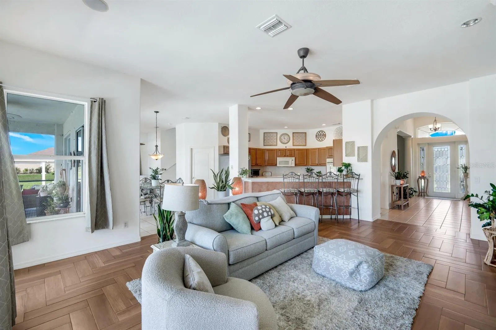 Welcome to this beautifully designed two-story David Weekley home located in the desirable northwest of Cape Coral. With 4 bedrooms, 3 full baths, and 3,090 square feet of living space, this home offers exceptional flexibility and comfort — perfect for families, multi-generational living, or those who love to entertain.