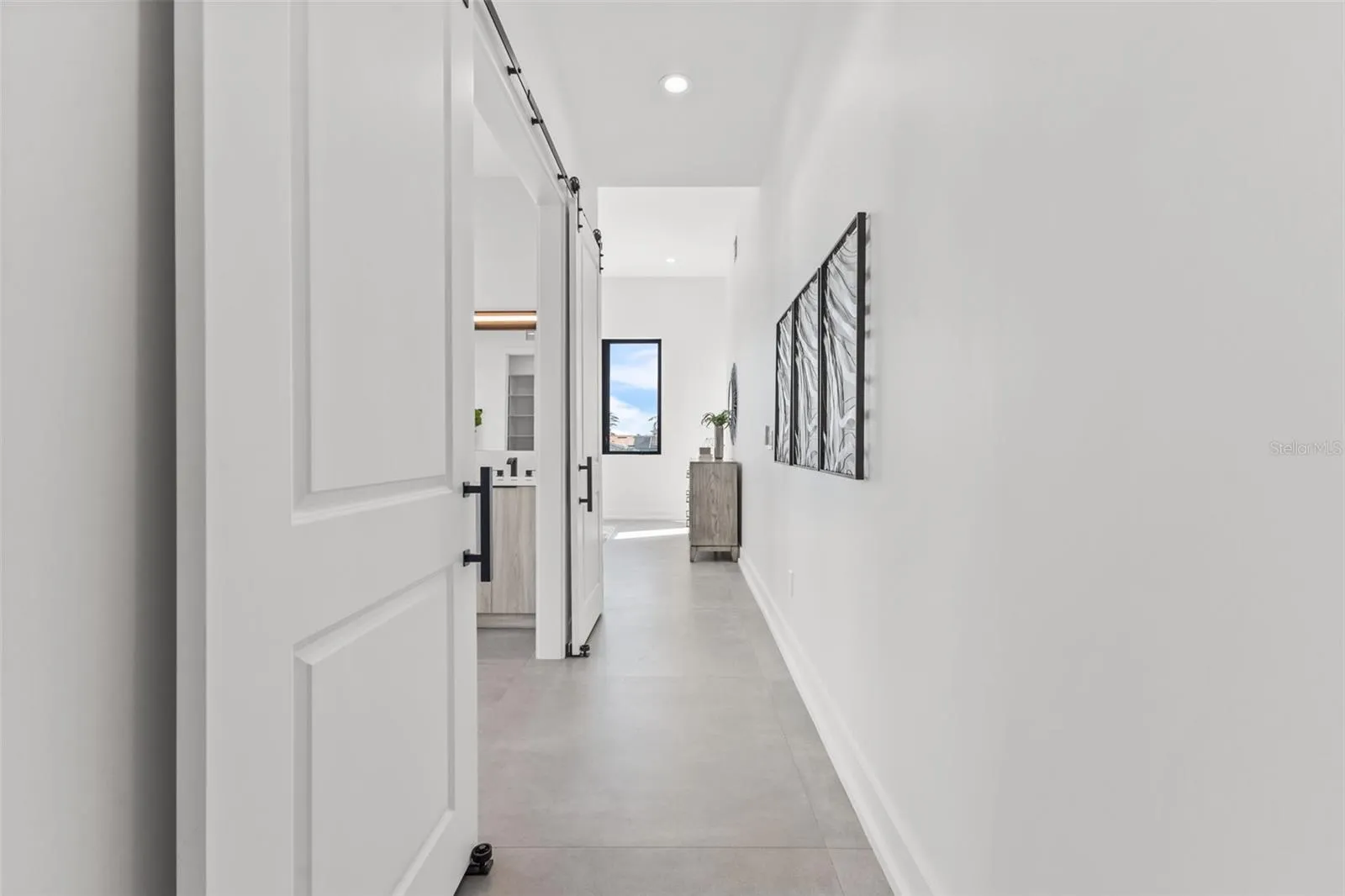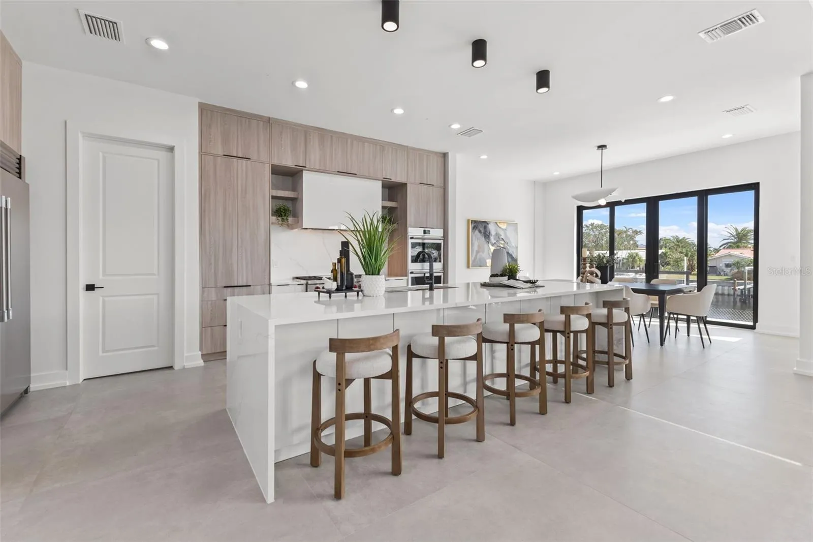 Step through the grand entryway into a light-filled open floor plan featuring a 22-foot ceiling, a dramatic wall of glass doors, and seamless indoor-outdoor living with panoramic water views. The gourmet chef’s kitchen showcases top-of-the-line Wolf and Bosch appliances, a massive 16-foot quartz island with seating for six, custom cabinetry, and a walk-in pantry with prep station—perfect for entertaining.