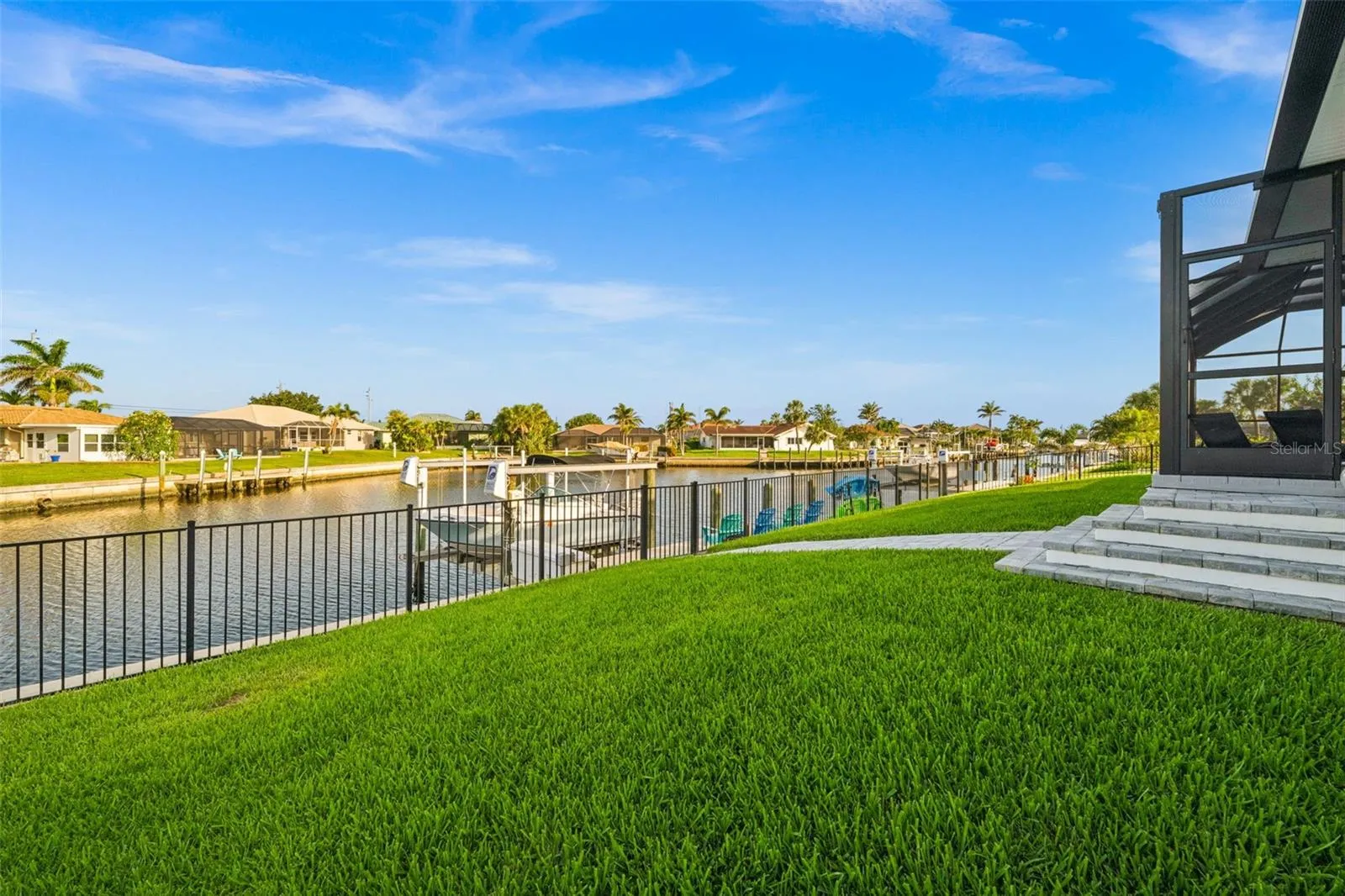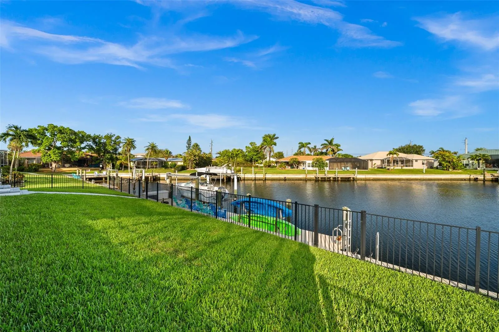 CUSTOM WATERFRONT home built by a local builder for himself located on a cul-de-sac with 80 FEET of water frontage in Punta Gorda Isles. BUILT UP 11.3 FEET FOR HIGHER ELEVATION & NO HOA FEES! CLICK ON THE VIRTUAL TOUR LINK 1 FOR THE VIDEO AND VIRTUAL LINK 2 FOR THE 3D TOUR. Inside, the home offers a spacious open floor plan featuring a formal entryway, expansive great room, and a gourmet kitchen designed to impress. Architectural highlights include soaring tray ceilings in the great room, master suite, and den, a rounded breakfast room with a compass medallion cove ceiling, crown molding, luxury vinyl plank flooring, and custom shiplap feature walls and ceilings. Upgraded finishes such as ball bearing hinges on all doors and a motorized window shade in the den add refined touches throughout. The kitchen is a chef’s dream, boasting gleaming marble countertops, two-tone cabinetry, and high-end GE Professional Series Café appliances, including a built-in convection oven, a Smart Five-in-One wall oven with Advantium Technology, gas range with hood, and RO water filtration system. A large walk-in pantry adds convenience, while the wine/coffee bar provides additional counter space, cabinetry, a prep sink, and a wine refrigerator. Additional features include under-cabinet lighting, breakfast bar seating, and a stylish textured subway tile backsplash. The split-bedroom floor plan provides ultimate privacy. The primary suite is a luxurious retreat with a spa-inspired en-suite bath offering dual split vanities, a private water closet, garden tub, and a tiled walk-in shower, all leading into a generously sized dressing room/closet. One guest suite is privately located behind the kitchen, while the second guest room and den share a beautifully appointed bath with a walk-in shower. The den features paneled walls and a picture window framing serene canal basin views. Step outside to your Florida-style outdoor oasis—the expansive lanai surrounds a heated, saltwater pool and attached spa, all enclosed in a picture-frame pool cage overlooking the wide canal basin. Two covered seating areas and a summer kitchen make entertaining effortless. The fenced backyard leads to a 45-foot extended concrete dock with 13,500-lb boat lift—perfect for keeping your vessel at your doorstep and enjoying some of the best boating and fishing in Southwest Florida. Additional features include: