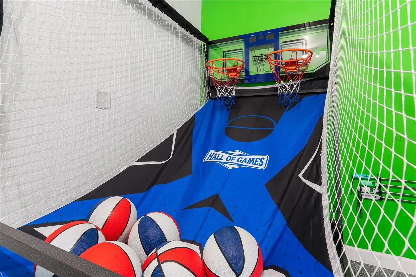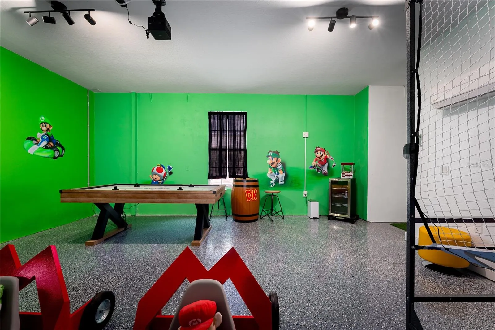 The home includes a garage games room with a basketball game, an air hockey table, video games, and a large screen TV.