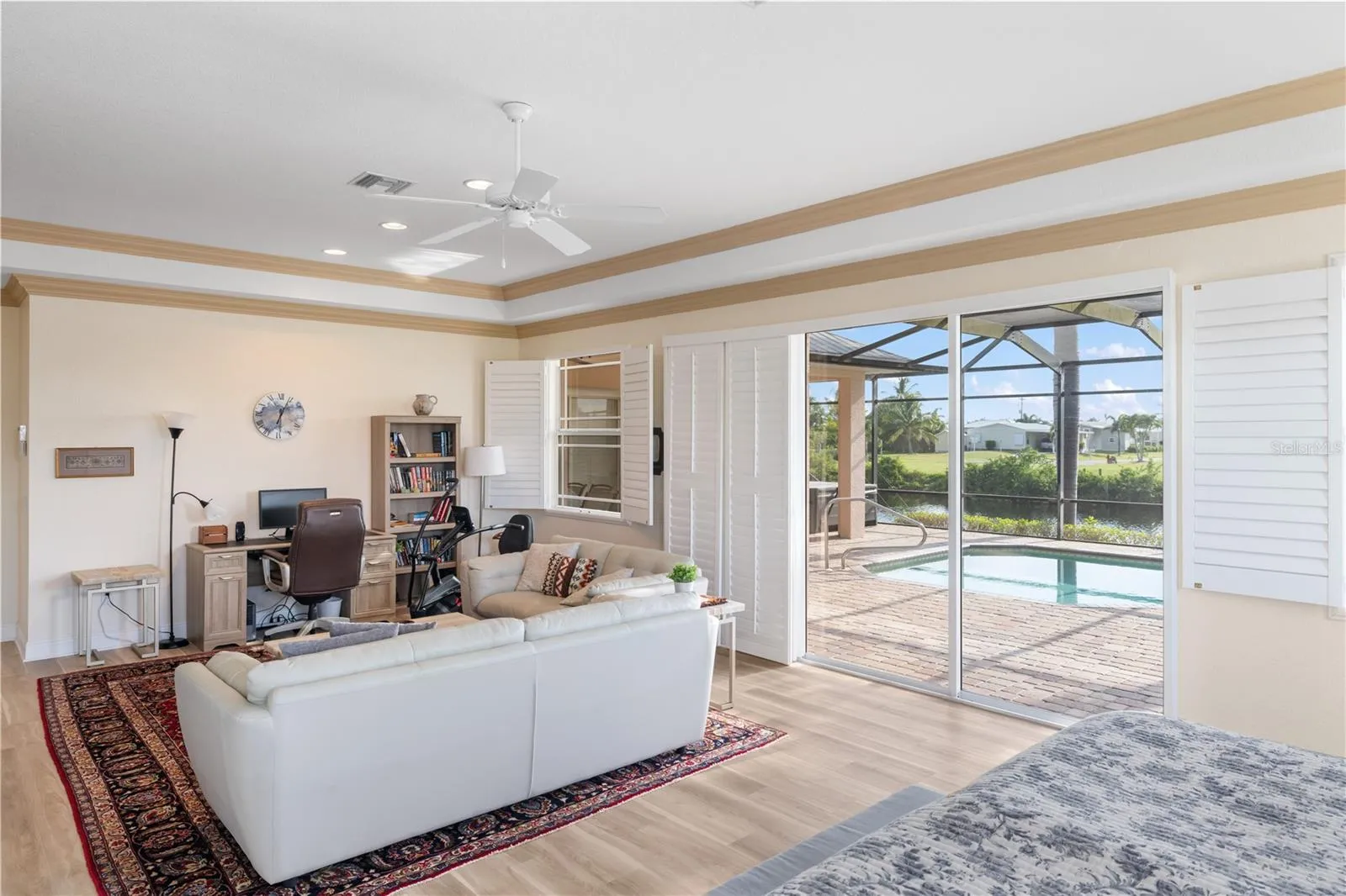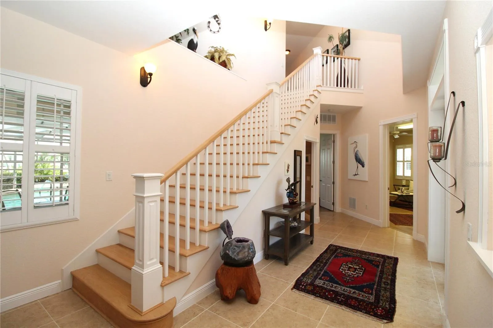 You will fall in love with this Beautiful Florida Home as you walk through the etched glass double doors….into the foyer that flows into the Great room with amazing views of your private saltwater heated pool and stunning views of the waterway. The living room area features vaulted ceilings with a built-in entertainment center that includes the tv. The Kitchen is a chef’s dream with a huge 2-tier breakfast bar, granite countertops, plenty of cabinets and countertop space and center island with wine rack for that extra touch…. The dinette area has three huge windows with exquisite views of the water…The formal dining room has tray ceiling with crown molding to give it that extra touch of class. The Primary bedroom is located on the main floor and is immaculate and huge, has two walk-in closets, large sitting area with sliding glass doors out to your private sparkling pool. Primary Bathroom is amazing with long vanity with dual sinks, garden tub, glass enclosed walk-in shower that is nicely tiled with 5 jets & handheld showerhead and separate toilet area. The second bedroom/office is also on the main floor and quite spacious with two closets. The second bathroom is on the main floor and features a nice vanity, glass enclosed walk-in shower, built-in shelves and door out to your lanai/pool area. The 3rd and 4th bedrooms are upstairs and have walk-in closets and both have sliding glass doors out to the adjoining balcony with new Nezan balcony railings with Spectacular Views of Your New Florida Lifestyle!! The third bathroom is just across from the two bedrooms upstairs… features long vanity with dual sinks, tub/shower with nice tile walls and linen closet.