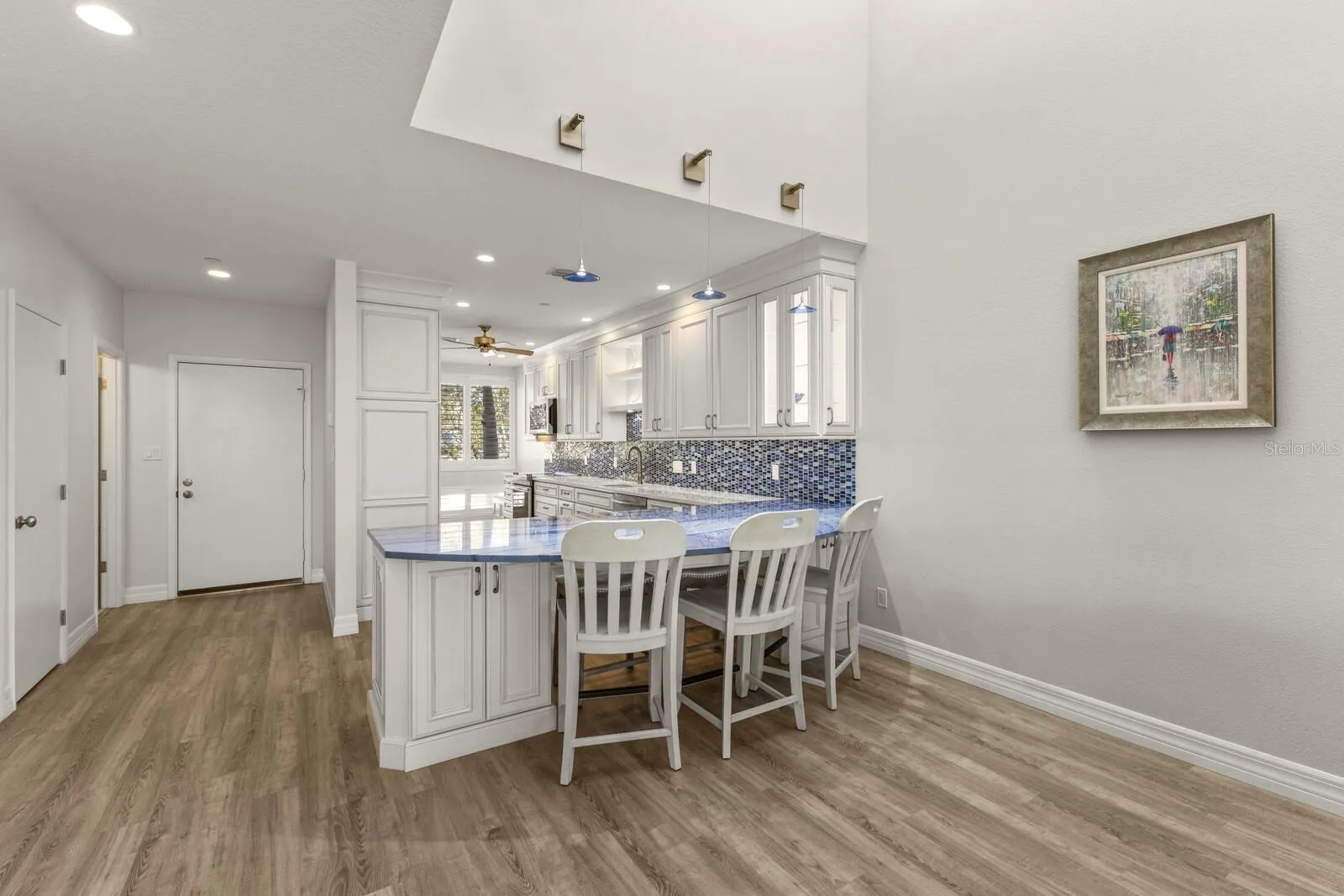 REDUCED PRICE! Are you looking for a RESORT home with spacious rooms, fine finishes, vaulted ceilings and the convenience of a condo community with bay and beach access? Look no further. Luxury and style await in this beautifully updated townhouse, located behind the gates of the exclusive Bay Isles resort. With 1,590 sq. ft. of meticulously designed and finished indoor living space plus another 1,100 sq. ft. of screened lanai, storage and garage space, this resort home provides the ultimate in luxe living, comfort and convenience. Upon entering this home, you’re greeted by an open concept great room and designer kitchen, vaulted ceilings, a conveniently placed guest bathroom, and views over the very private community pool. You’ll never want to leave! The gourmet kitchen is a chef’s dream, featuring gleaming granite countertops including a striking azure blue granite breakfast bar, custom mosaic glass tile backsplash, solid wood cabinetry, and stainless JennAir appliances. Easy to maintain luxury vinyl plank floors flow throughout, adding sophistication and durability. Soaring cathedral ceilings and abundant natural light enhance the light, bright, spacious feel of this home and the private screened lanai offers a serene retreat with access to lushly landscaped grounds and the resort style pool. The oversized primary suite boasts vaulted ceilings, a walk-in closet, and an elegant ensuite bath with natural stone and custom tile shower. The second bedroom also has a vaulted ceiling plus walk-in closet and beautifully finished adjacent bathroom. The ground-level garage has extra depth enabling covered parking for two cars plus there’s a separate room that can be flexibly used for storage, a home gym, or a wine cellar. As a Bay Isles resident, you’ll enjoy exclusive access to resident-only amenities including a private clubhouse, fitness center, heated pool and spa, tennis courts, and the private Bay Isles Beach Club. This resort home is just minutes from the vibrant dining, shopping, and cultural scene of St. Armands Circle and downtown Sarasota. See this home today and enjoy the best of Longboat Key living.